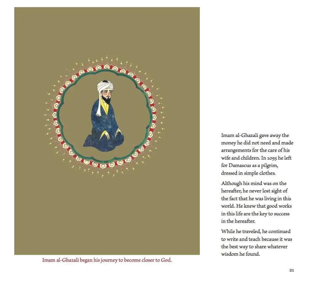 This book, an illustrated biography for both parents and children—with adjacent text for both—presents this inspiring life with exquisite miniatures in the Persian style. The biography covers his humble birth and education, rise to fame, spiritual crisis, and subsequent journeying to find the Truth in Syria, Palestine, and Mecca before returning home, having purified his heart.