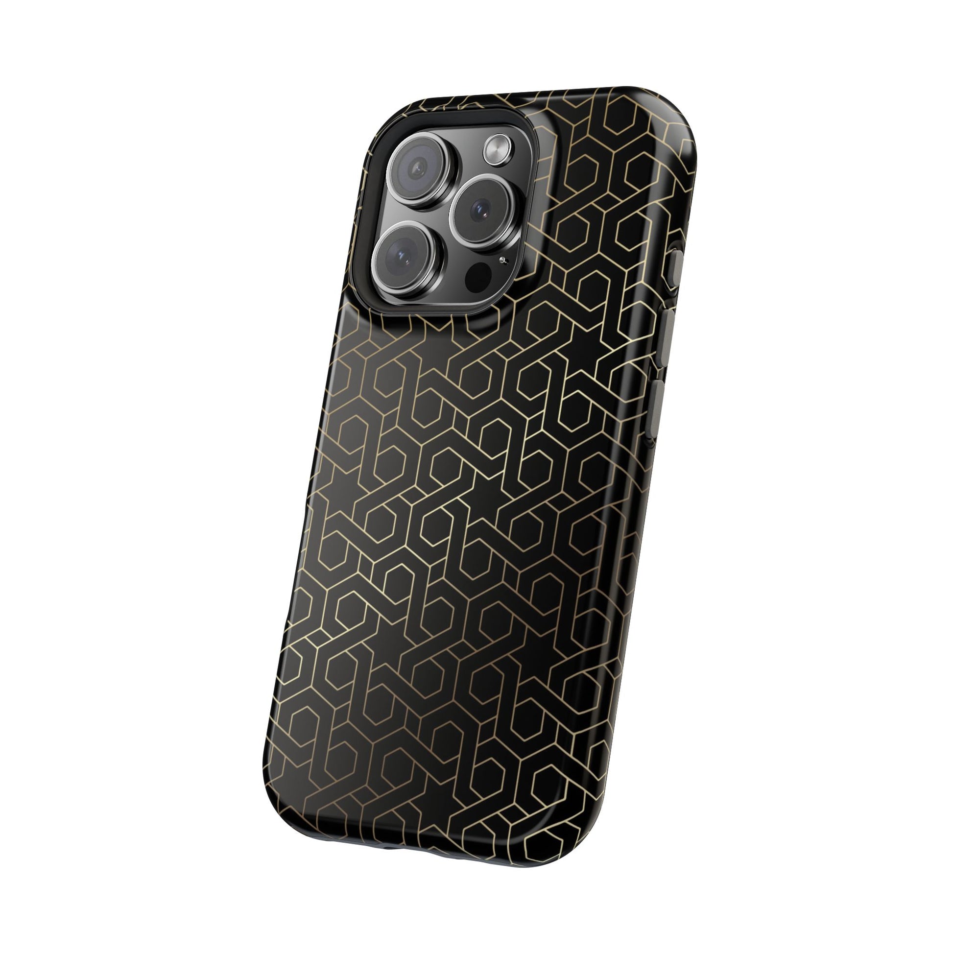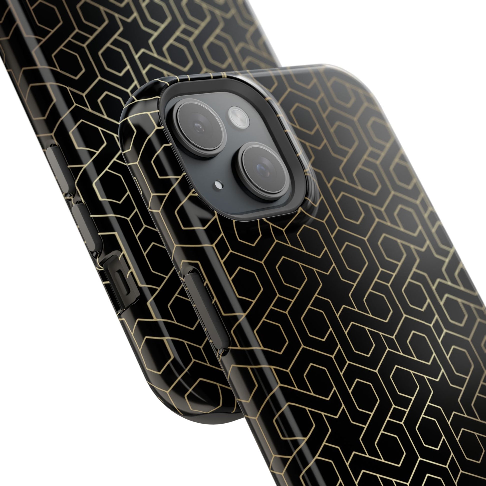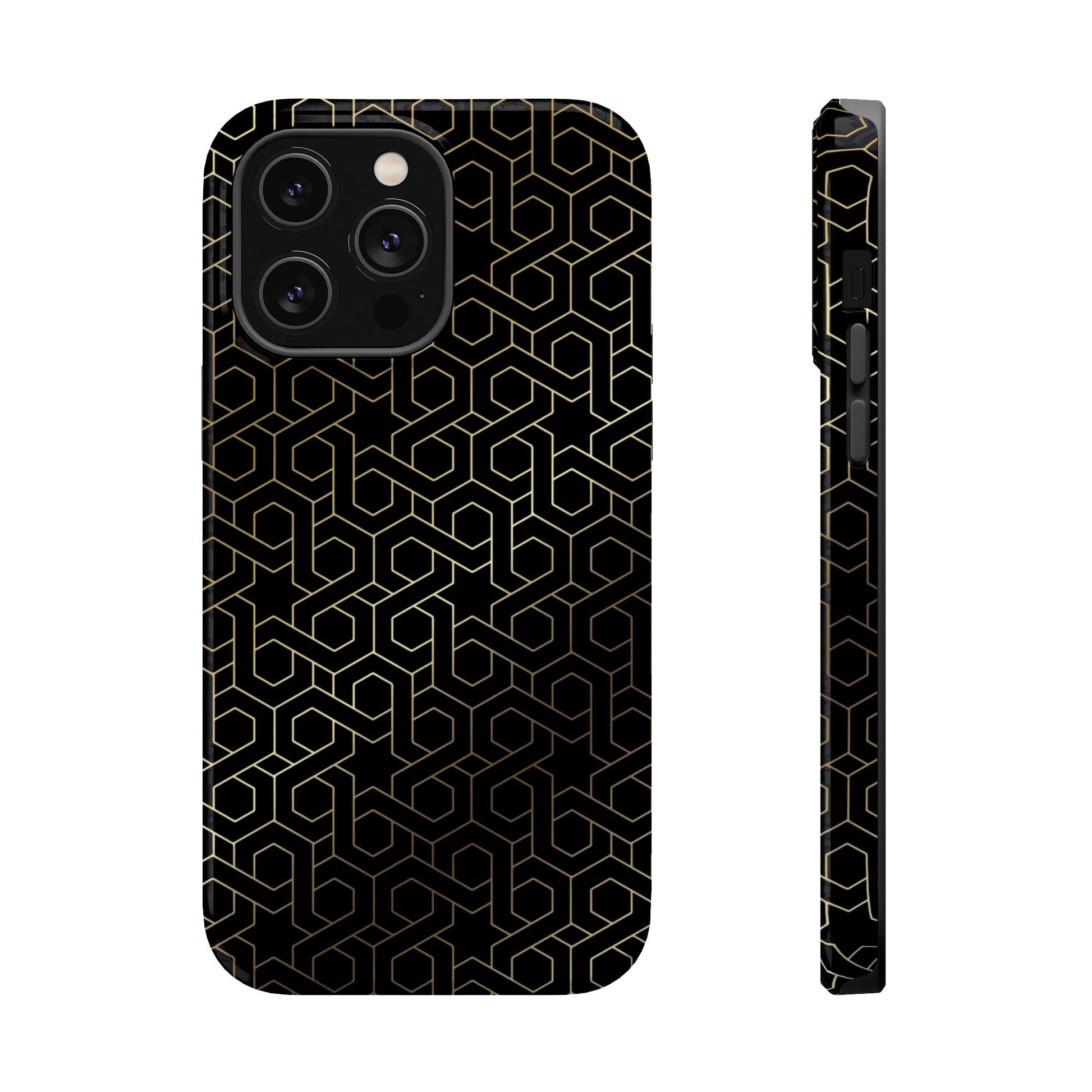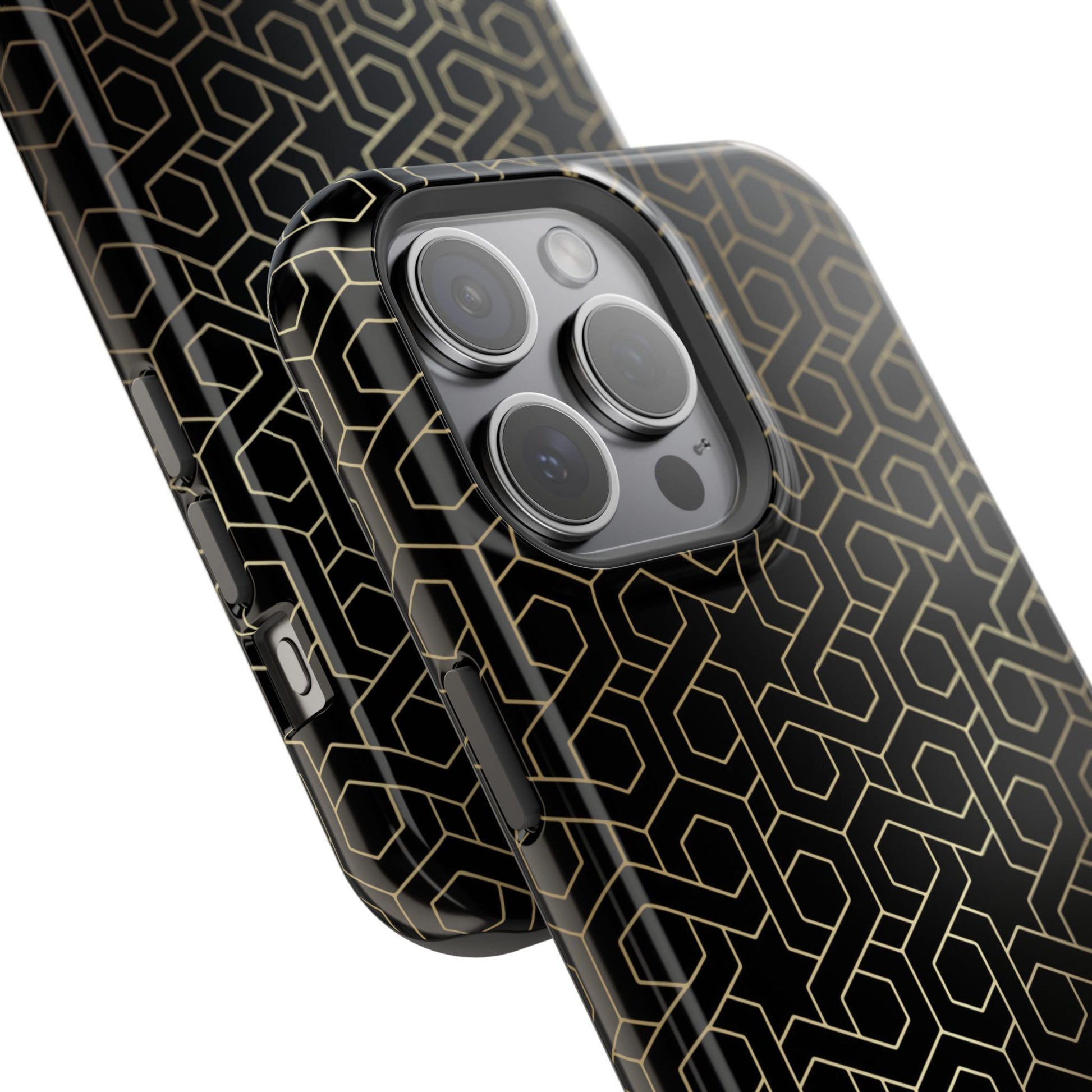 Black and gold ⭐️ Geometric magnetic phone case. Equipped with an outer polycarbonate shell and inner black TPU lining, this case delivers robust protection thanks to its durable, flexible, impact-resistant nature. Available in a matte or glossy finish, each case comes with an embedded magnet module that is compatible with MagSafe® accessories and a stunning print that fully wraps around your case's exterior.