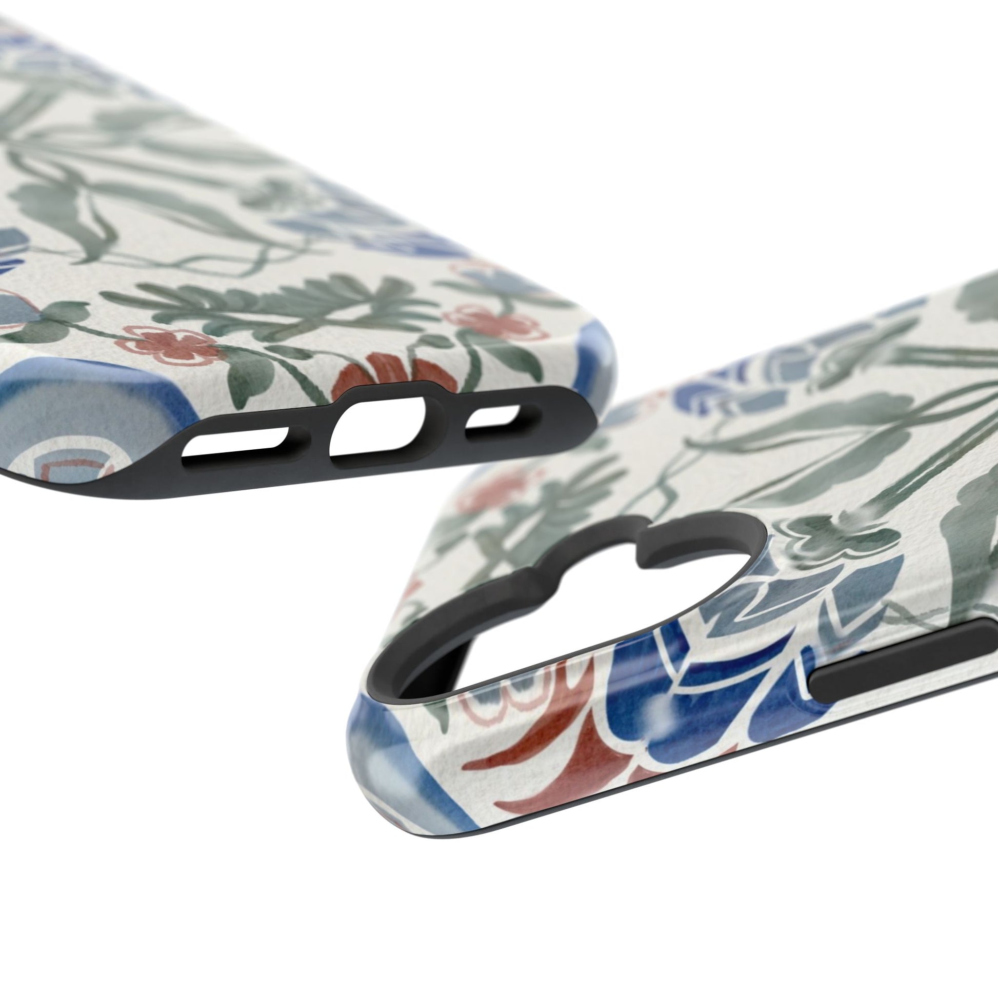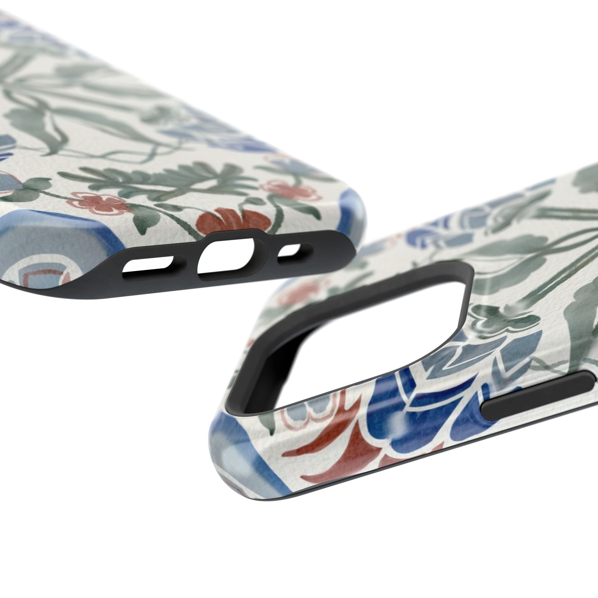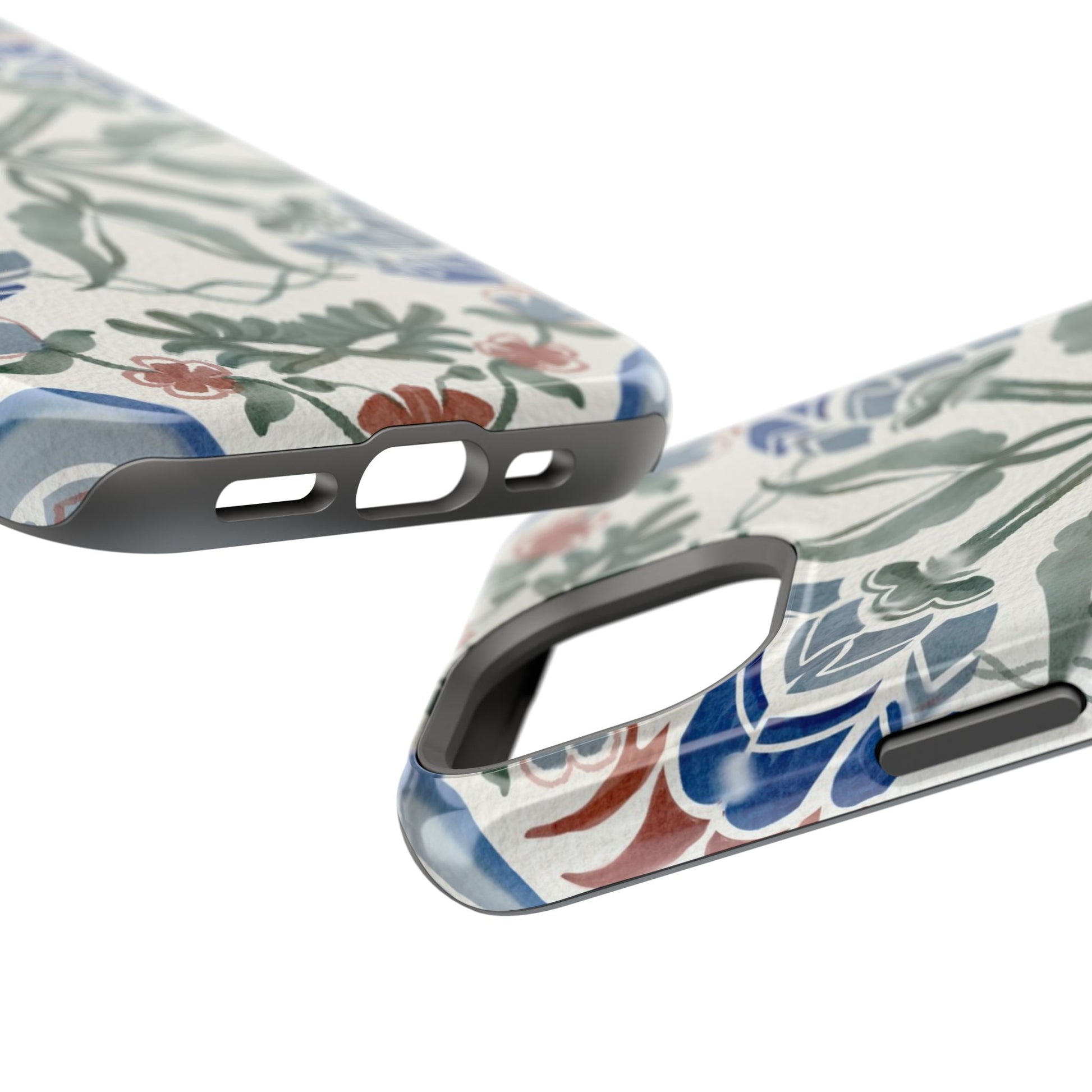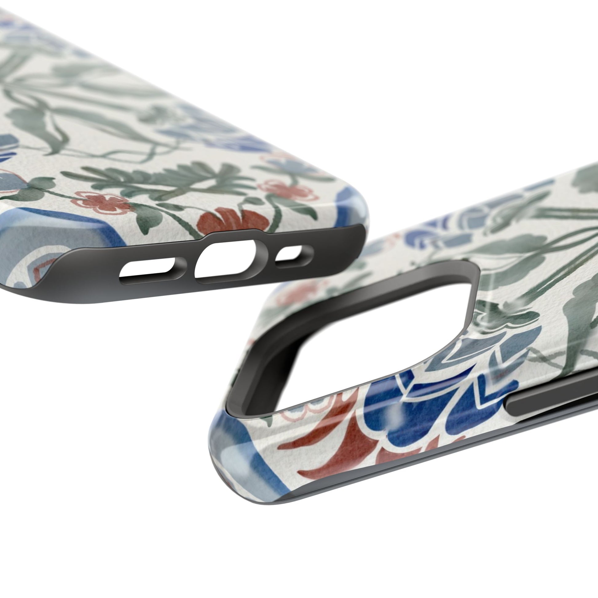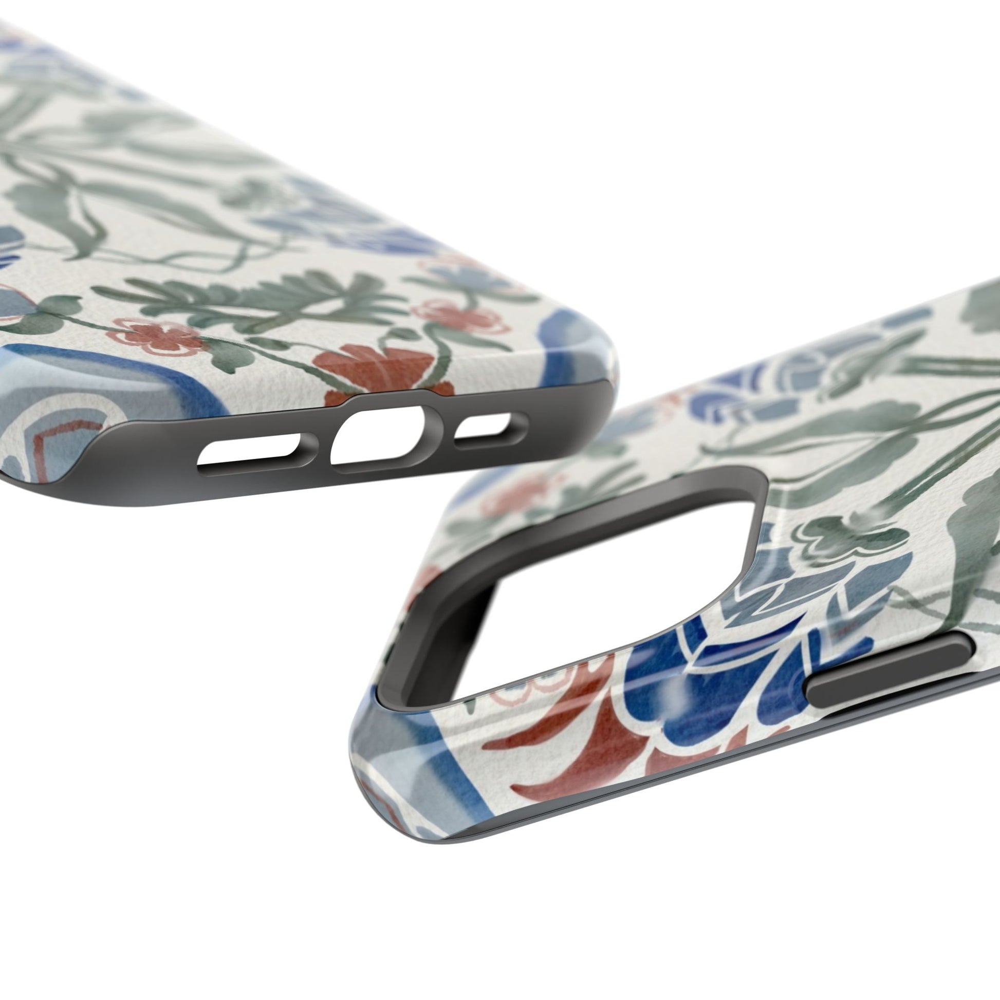 Magnetic tough case. Equipped with an outer polycarbonate shell and inner black TPU lining, this case delivers robust protection thanks to its durable, flexible, impact-resistant nature. Available in a matte or glossy finish, each case comes with an embedded magnet module that is compatible with MagSafe® accessories and a stunning print that fully wraps around your case's exterior.