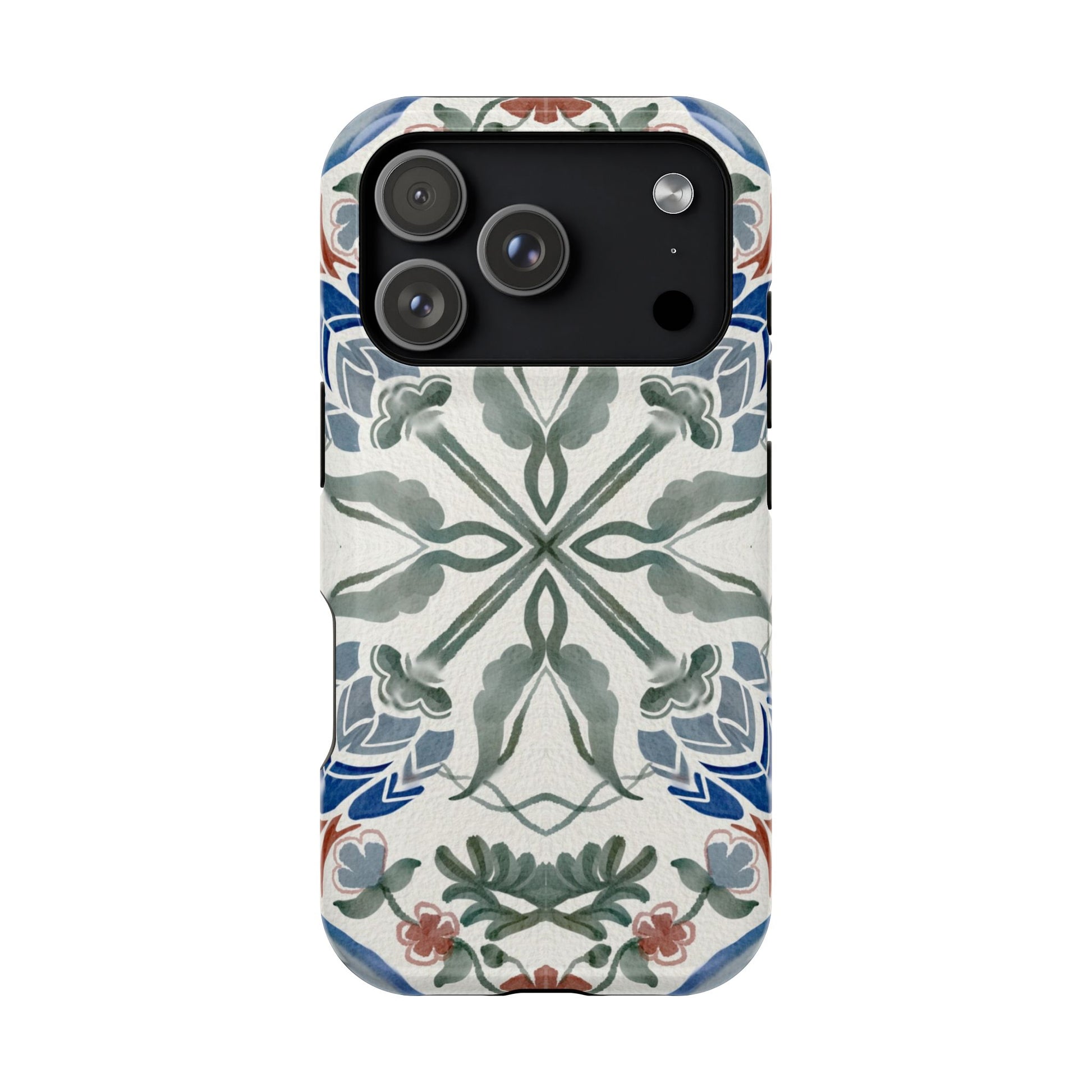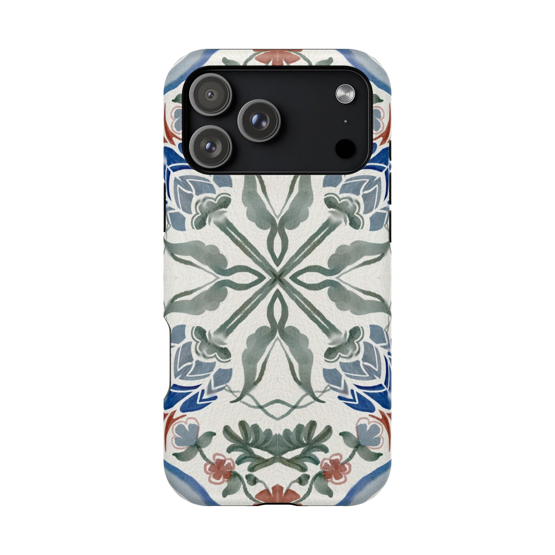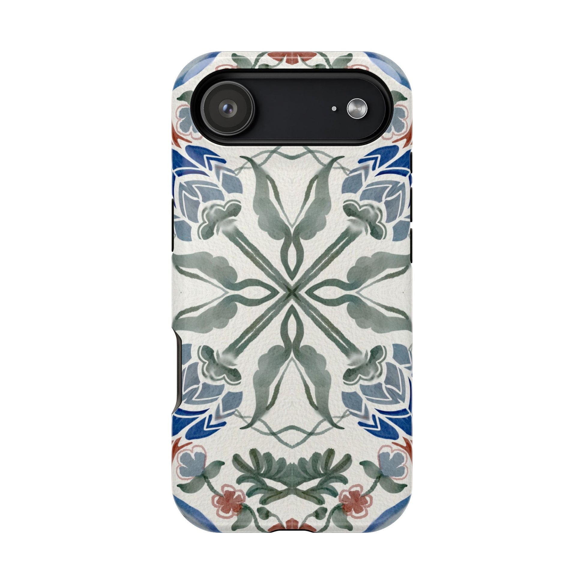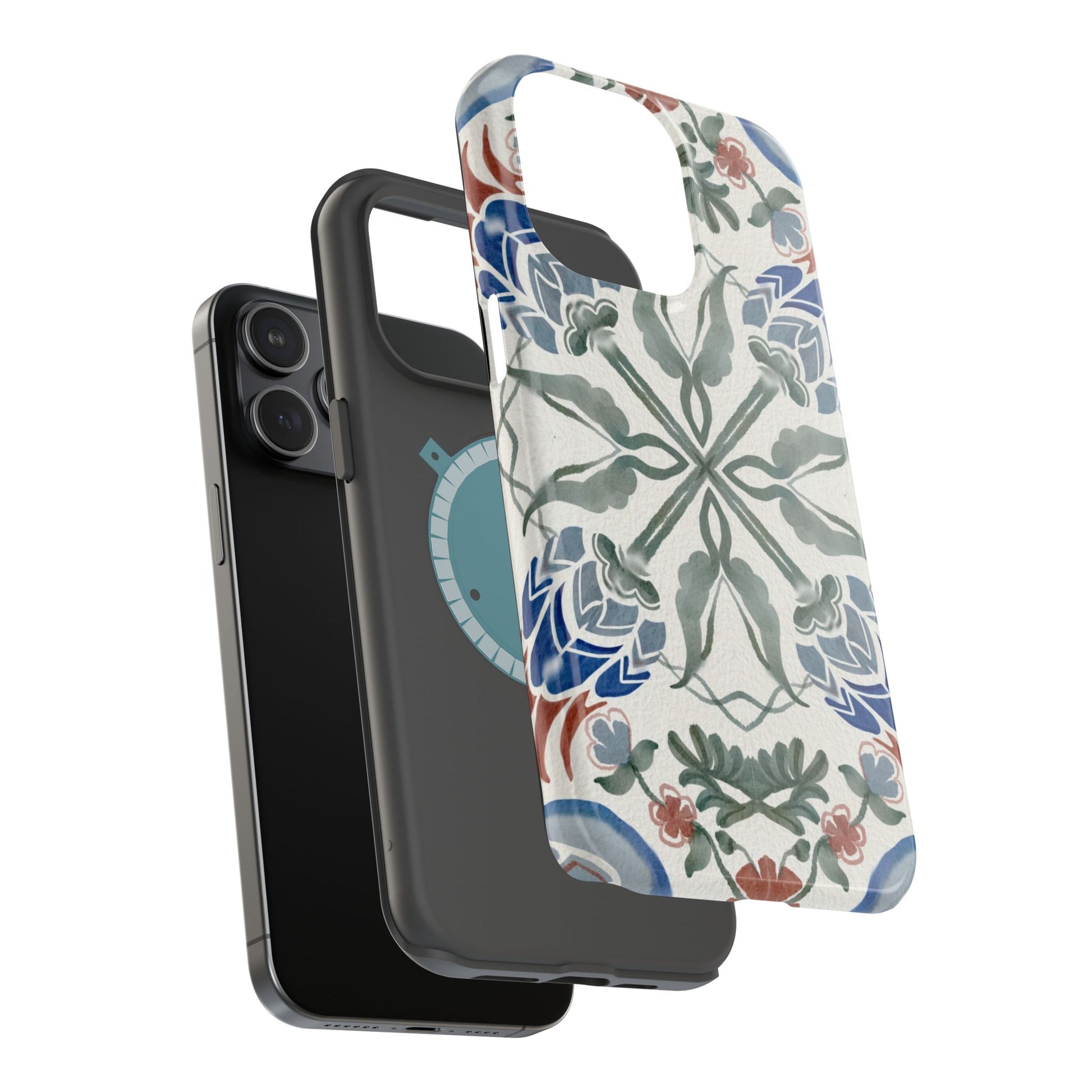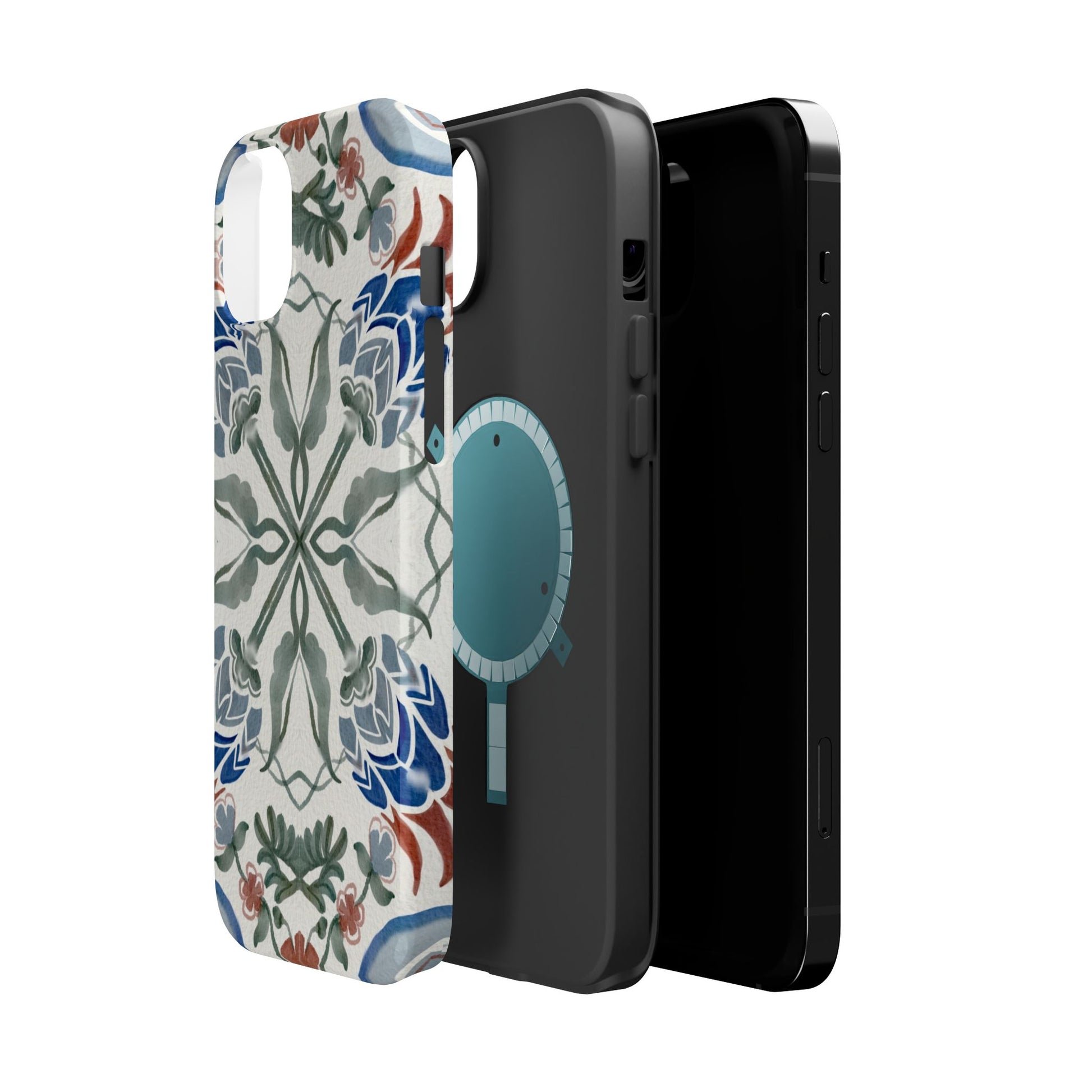 Magnetic tough case. Equipped with an outer polycarbonate shell and inner black TPU lining, this case delivers robust protection thanks to its durable, flexible, impact-resistant nature. Available in a matte or glossy finish, each case comes with an embedded magnet module that is compatible with MagSafe® accessories and a stunning print that fully wraps around your case's exterior.