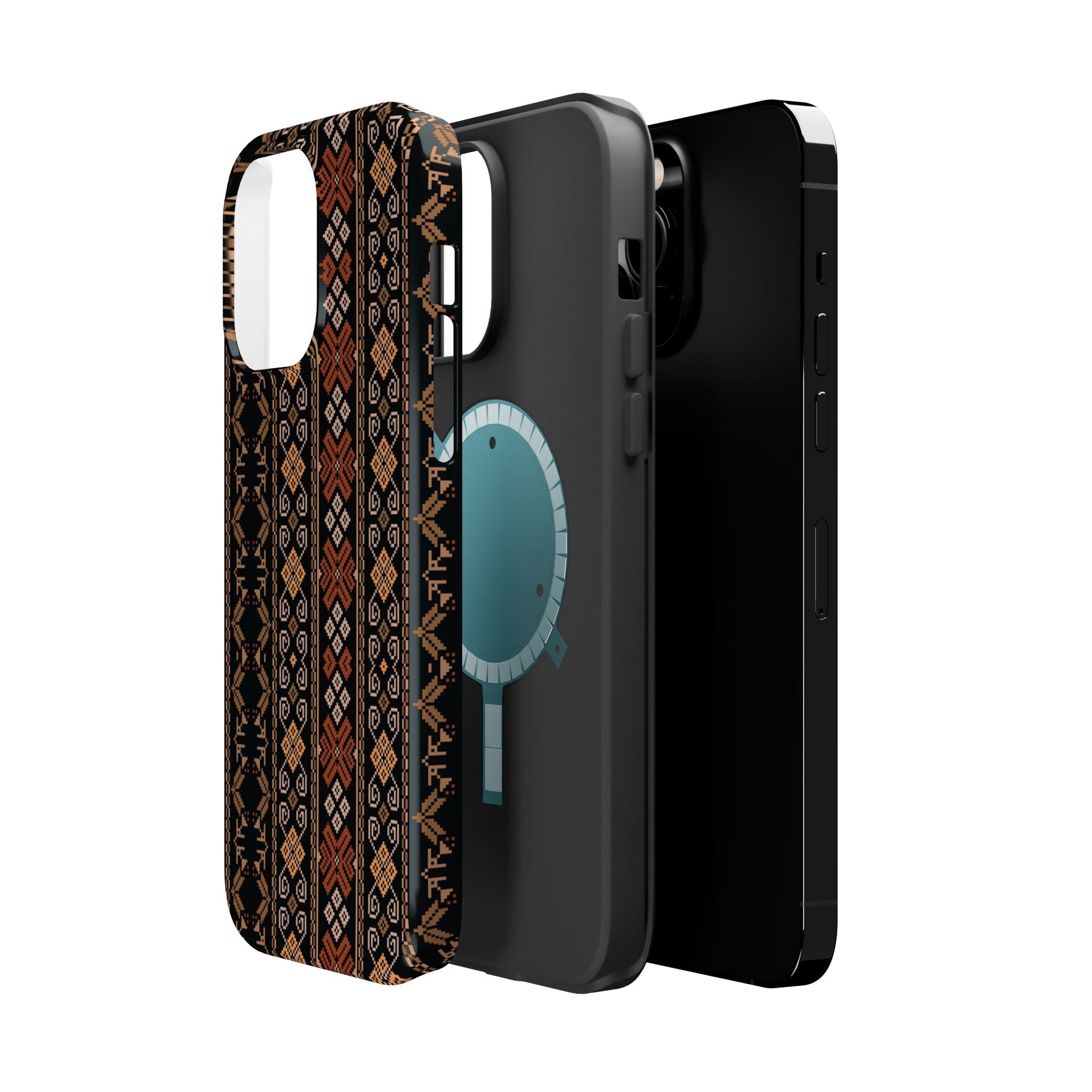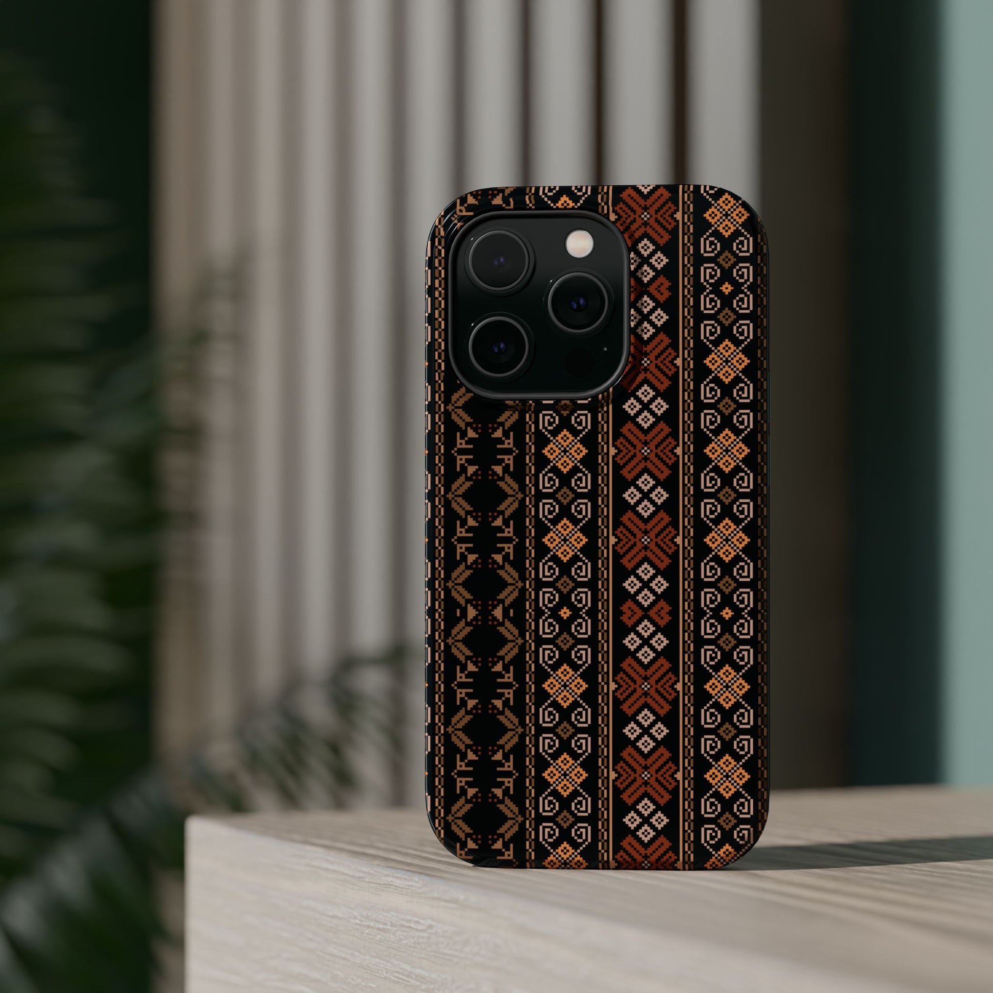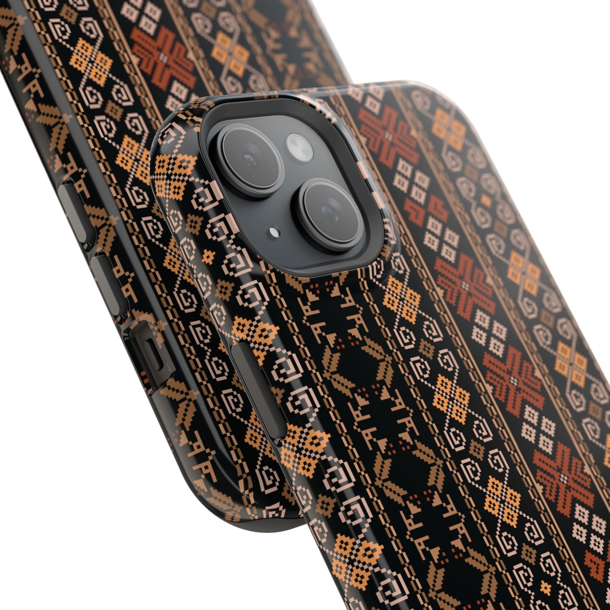 Floral Tatriz Geometric design magnetic phone case. Equipped with an outer polycarbonate shell and inner black TPU lining, this case delivers robust protection thanks to its durable, flexible, impact-resistant nature. Available in a matte or glossy finish, each case comes with an embedded magnet module that is compatible with MagSafe® accessories and a stunning print that fully wraps around your case's exterior.