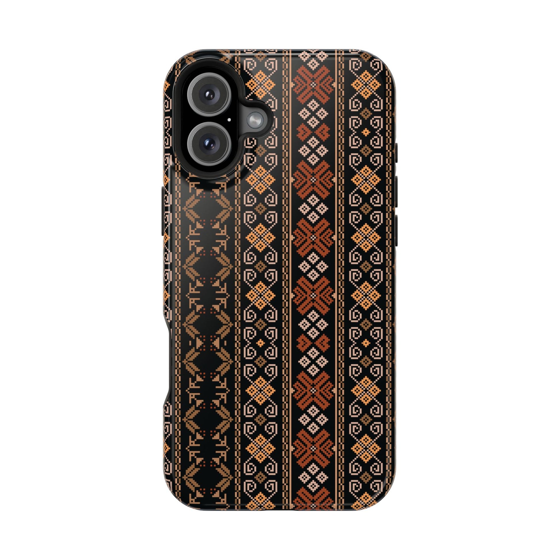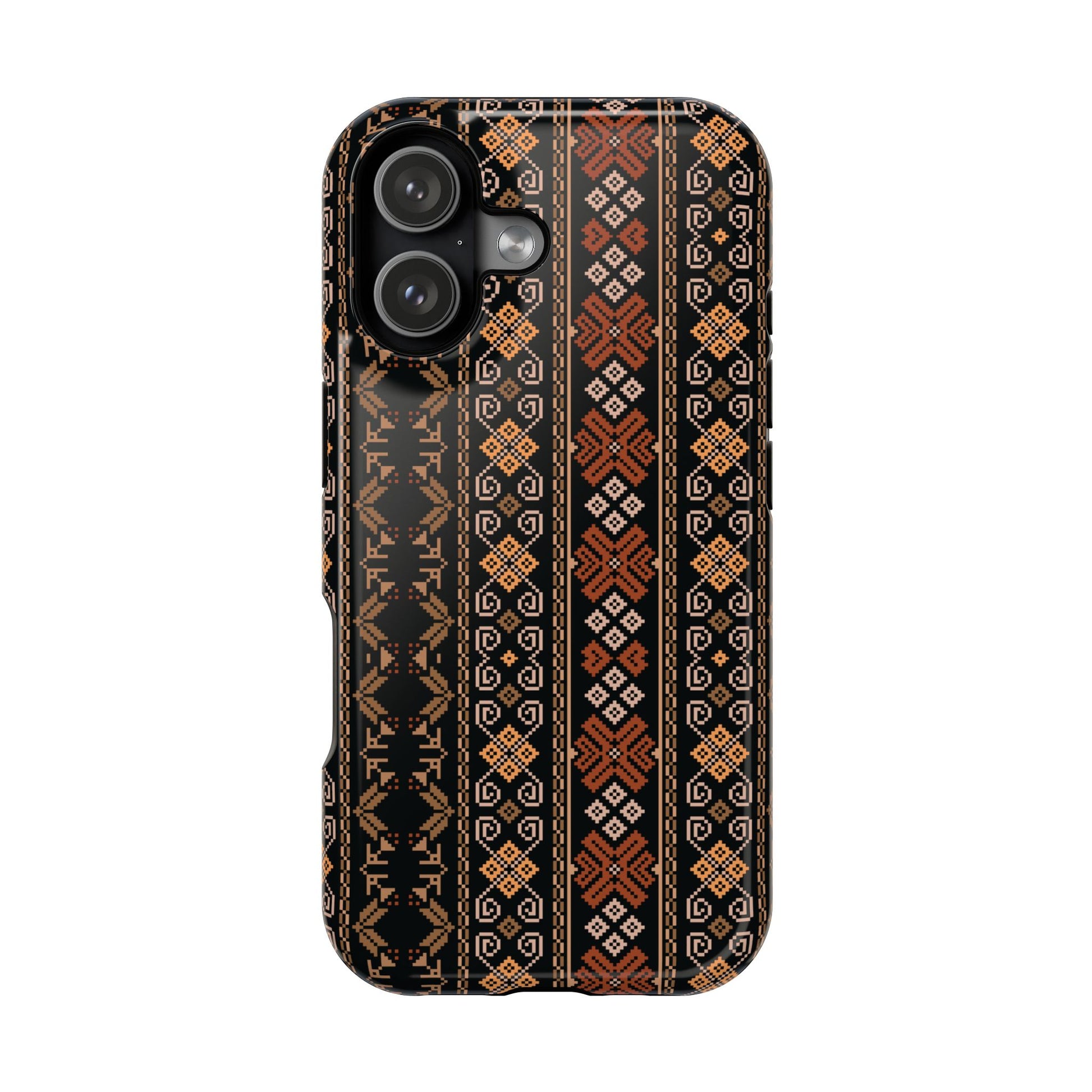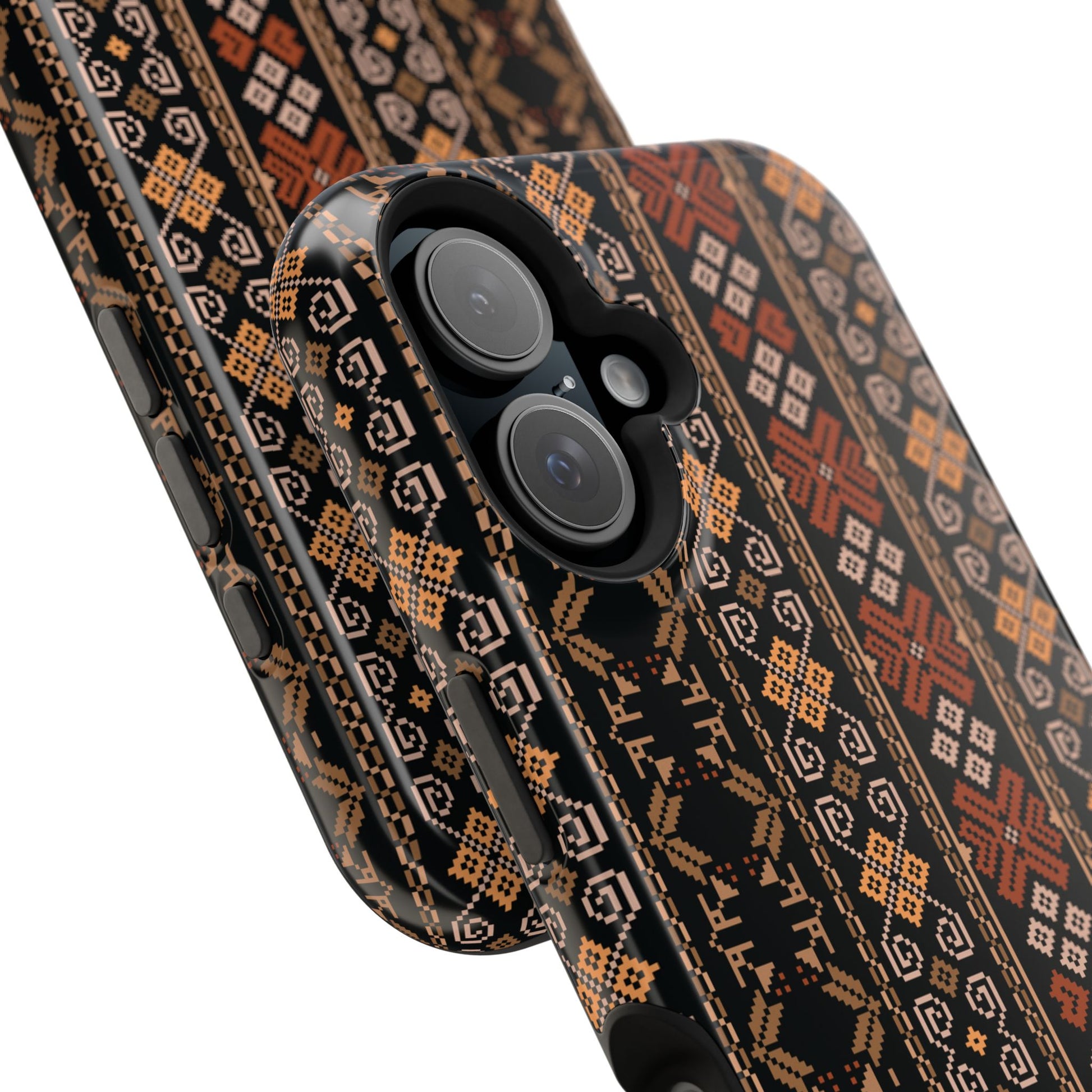 Floral Tatriz Geometric design magnetic phone case. Equipped with an outer polycarbonate shell and inner black TPU lining, this case delivers robust protection thanks to its durable, flexible, impact-resistant nature. Available in a matte or glossy finish, each case comes with an embedded magnet module that is compatible with MagSafe® accessories and a stunning print that fully wraps around your case's exterior.