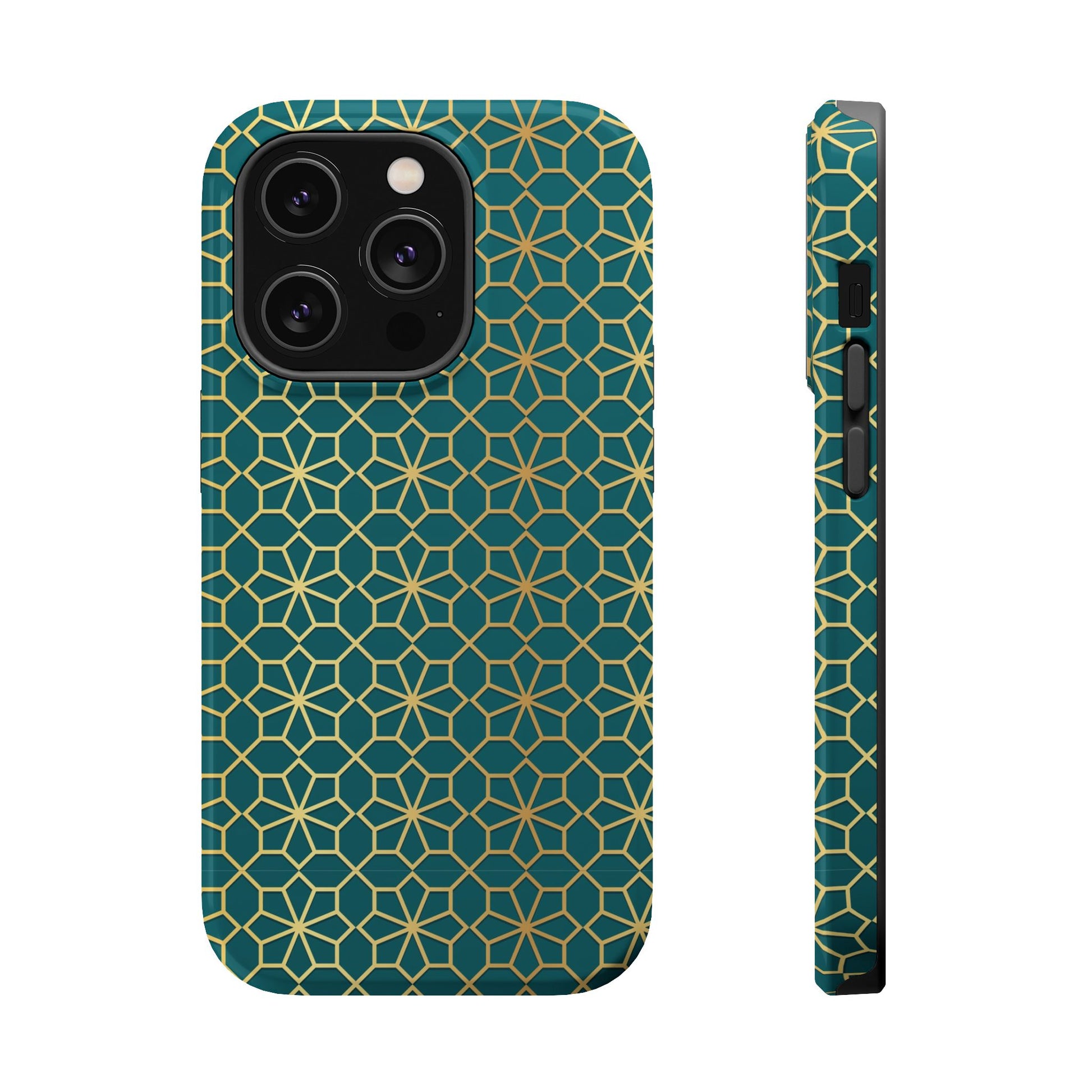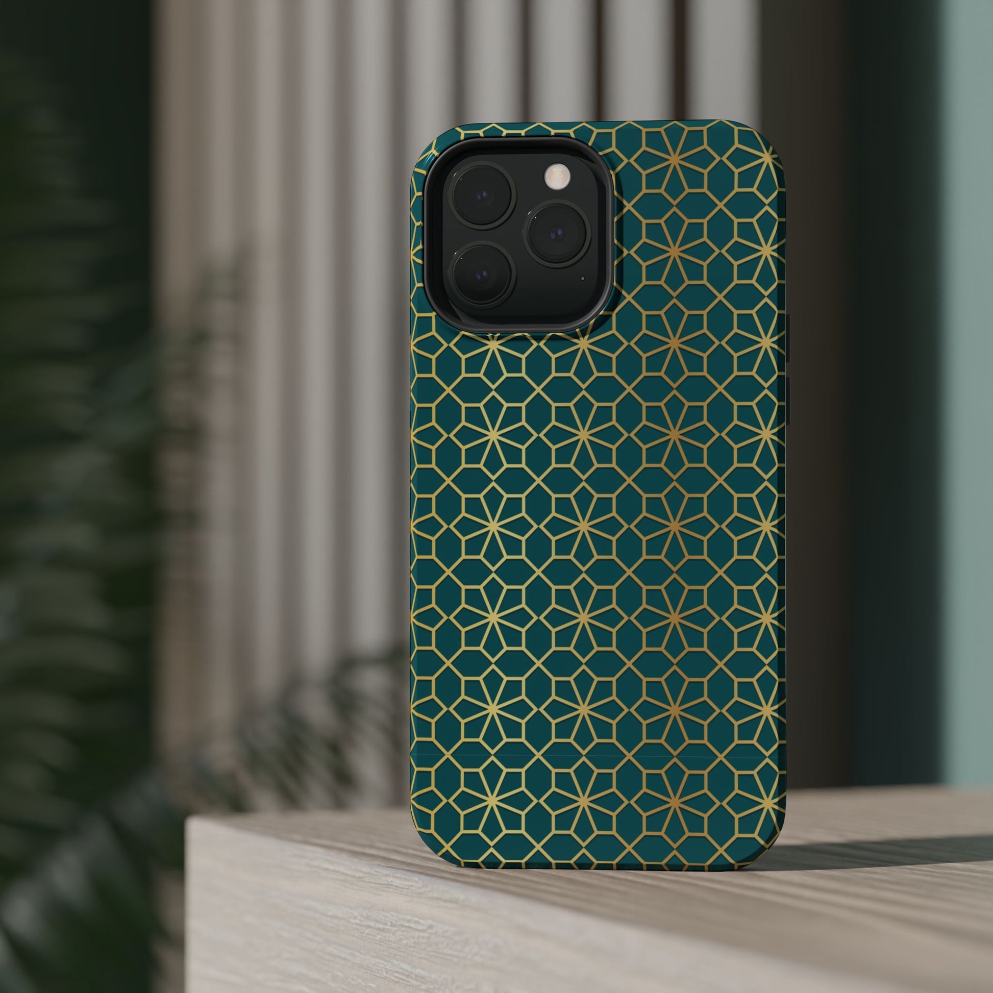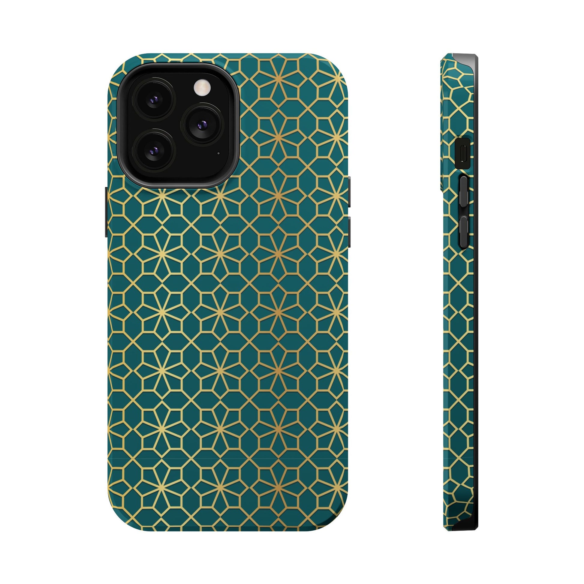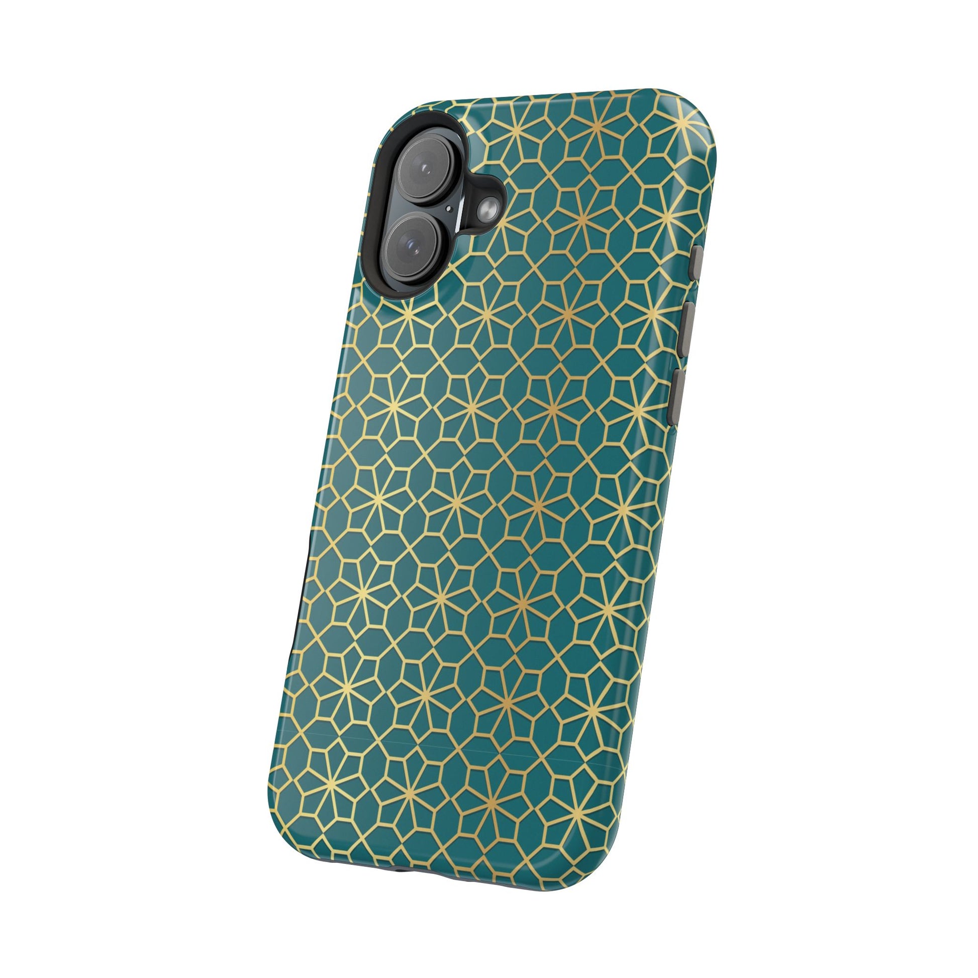 Green and gold flower design magnetic phone case. Equipped with an outer polycarbonate shell and inner black TPU lining, this case delivers robust protection thanks to its durable, flexible, impact-resistant nature. Available in a matte or glossy finish, each case comes with an embedded magnet module that is compatible with MagSafe® accessories and a stunning print that fully wraps around your case's exterior.