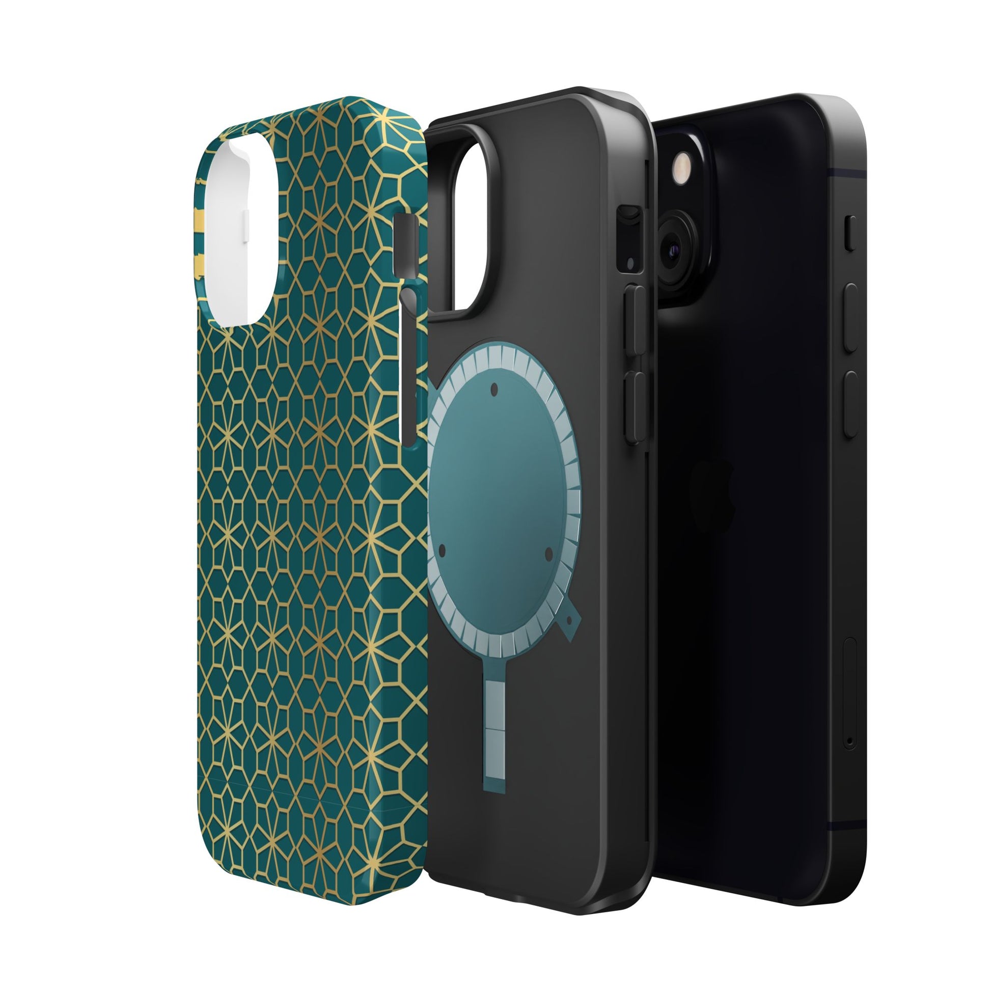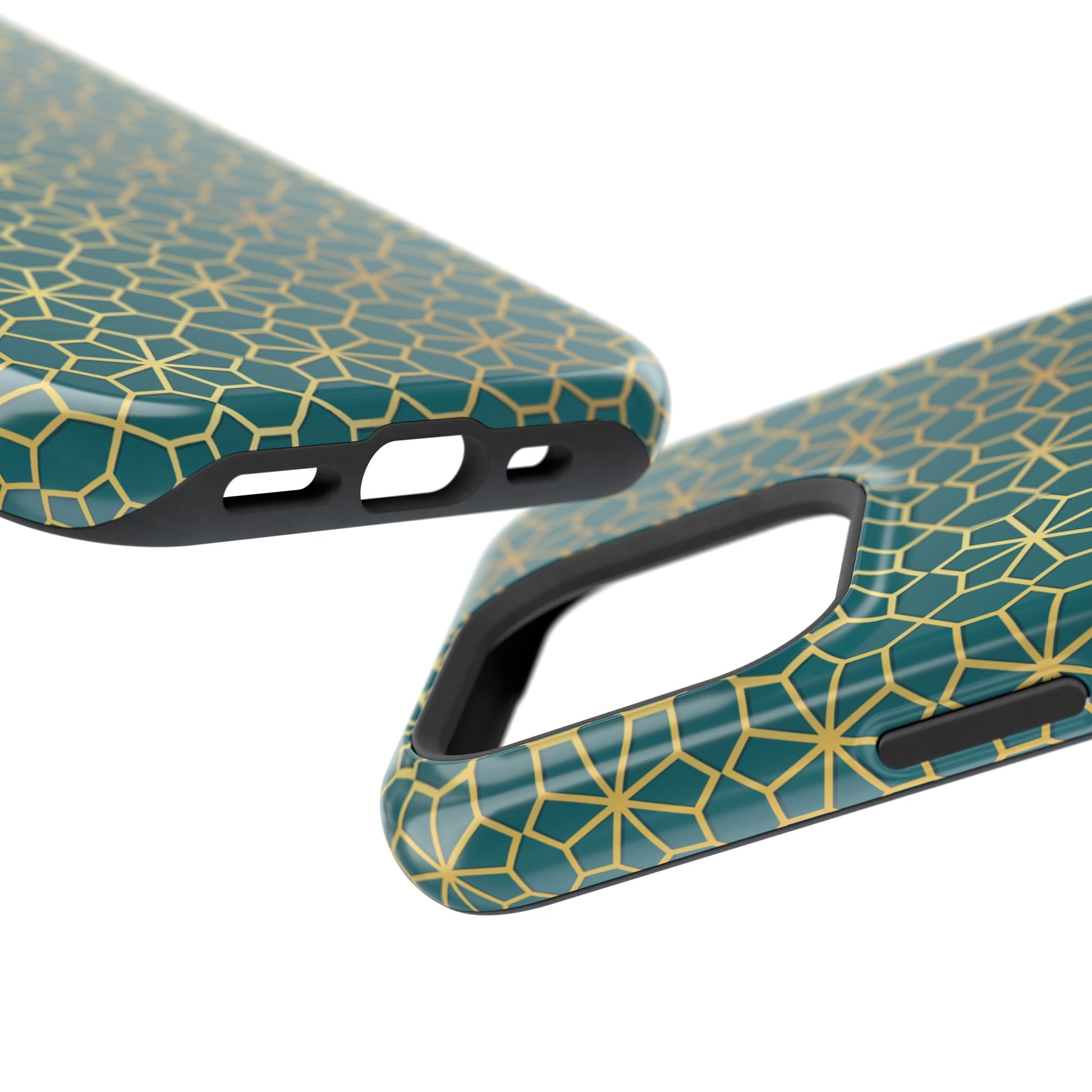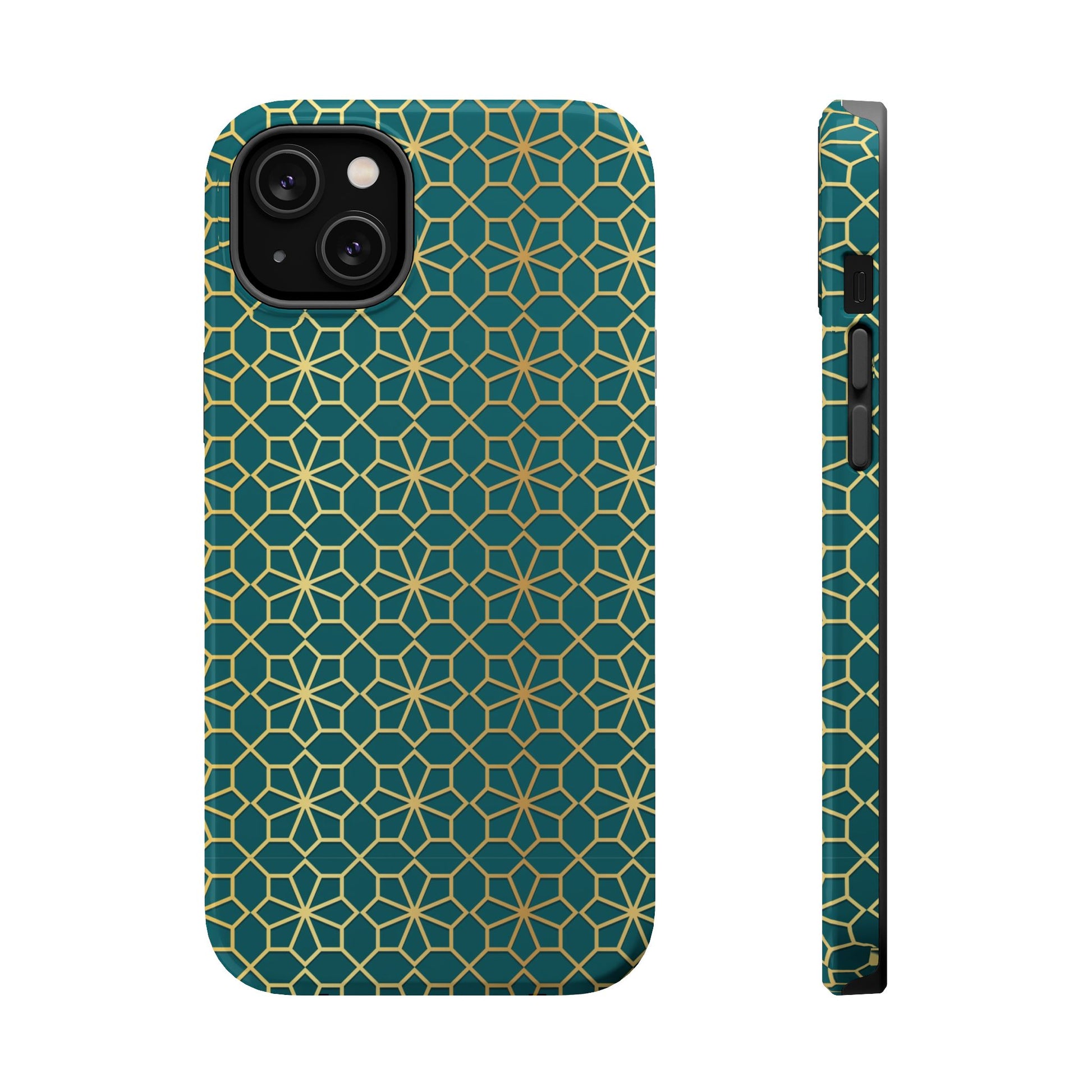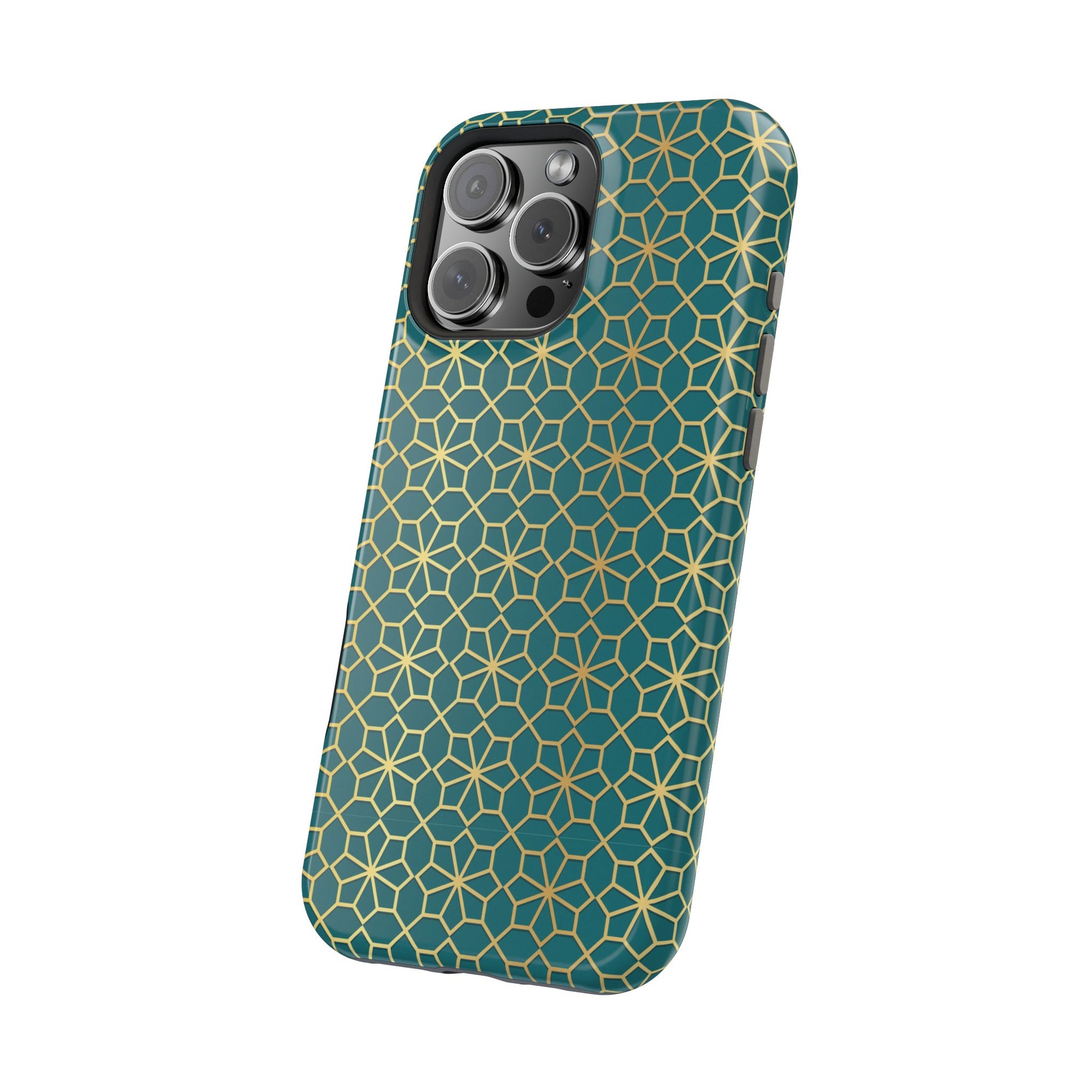 Green and gold flower design magnetic phone case. Equipped with an outer polycarbonate shell and inner black TPU lining, this case delivers robust protection thanks to its durable, flexible, impact-resistant nature. Available in a matte or glossy finish, each case comes with an embedded magnet module that is compatible with MagSafe® accessories and a stunning print that fully wraps around your case's exterior.