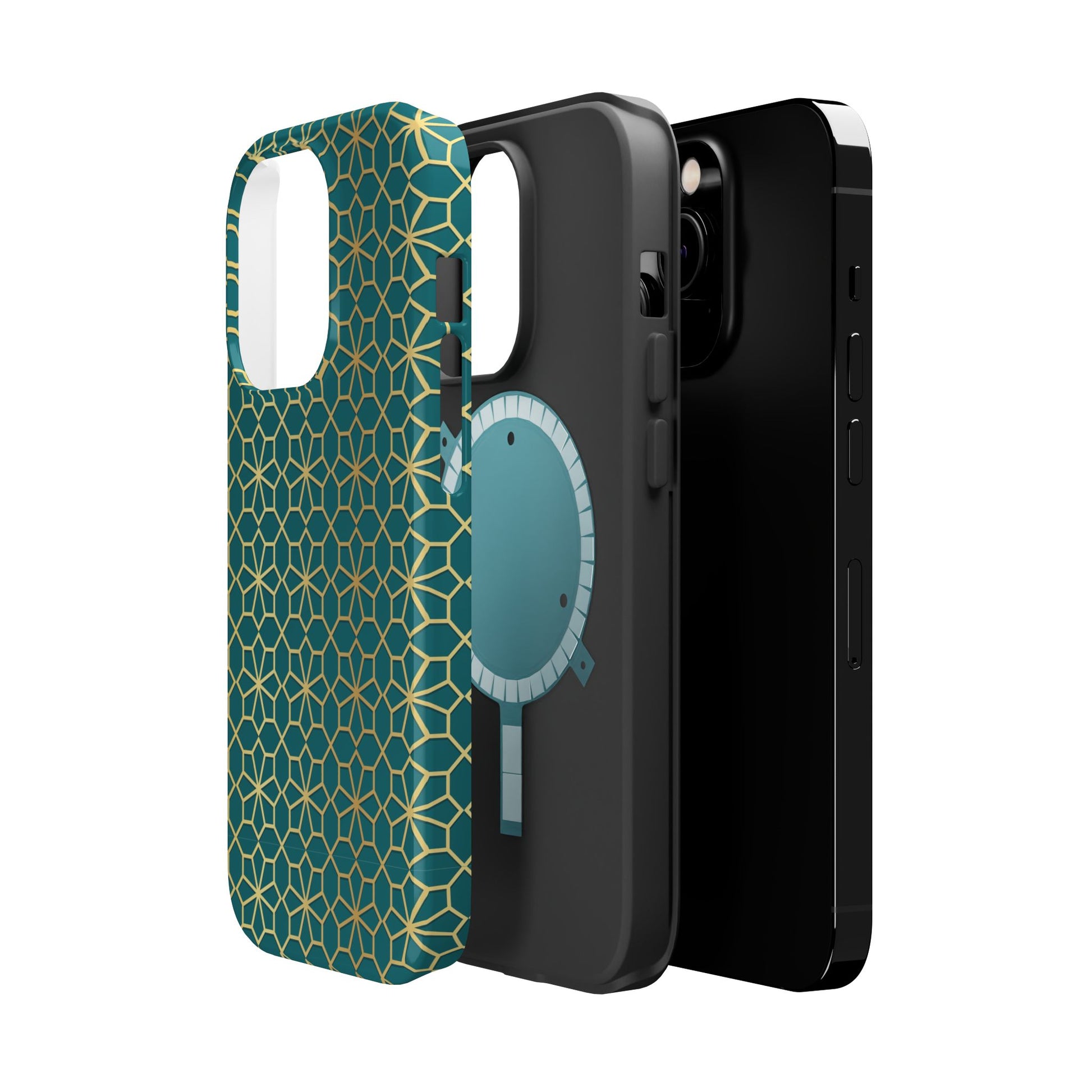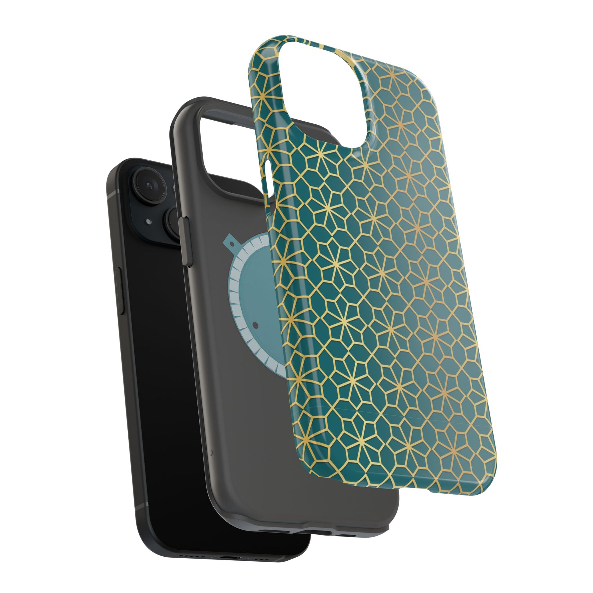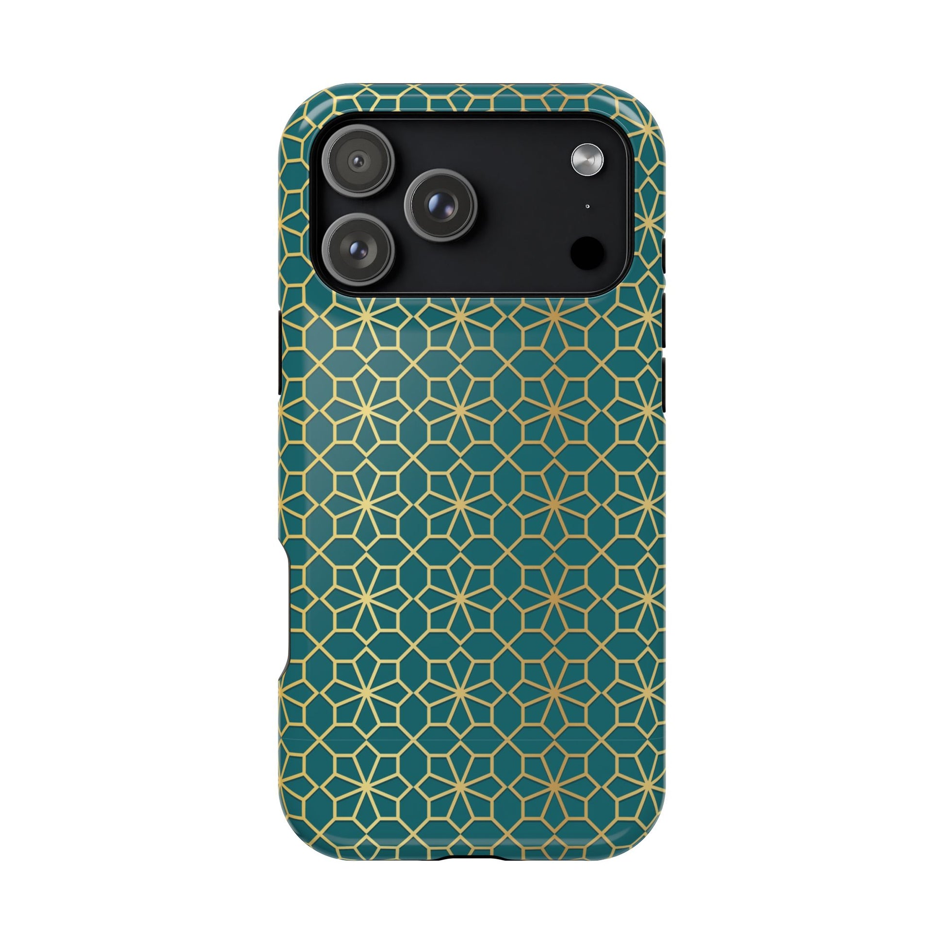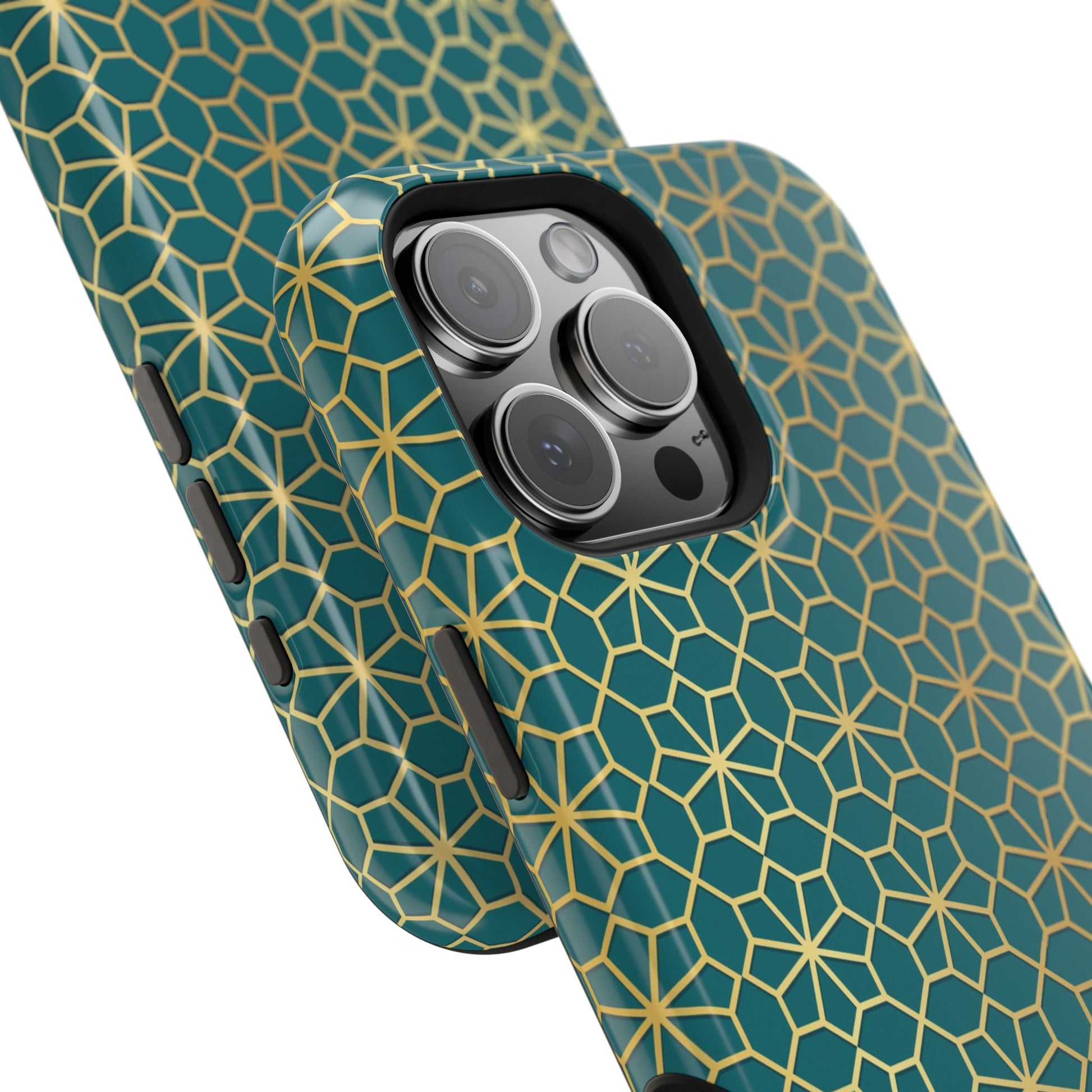 Green and gold flower design magnetic phone case. Equipped with an outer polycarbonate shell and inner black TPU lining, this case delivers robust protection thanks to its durable, flexible, impact-resistant nature. Available in a matte or glossy finish, each case comes with an embedded magnet module that is compatible with MagSafe® accessories and a stunning print that fully wraps around your case's exterior.