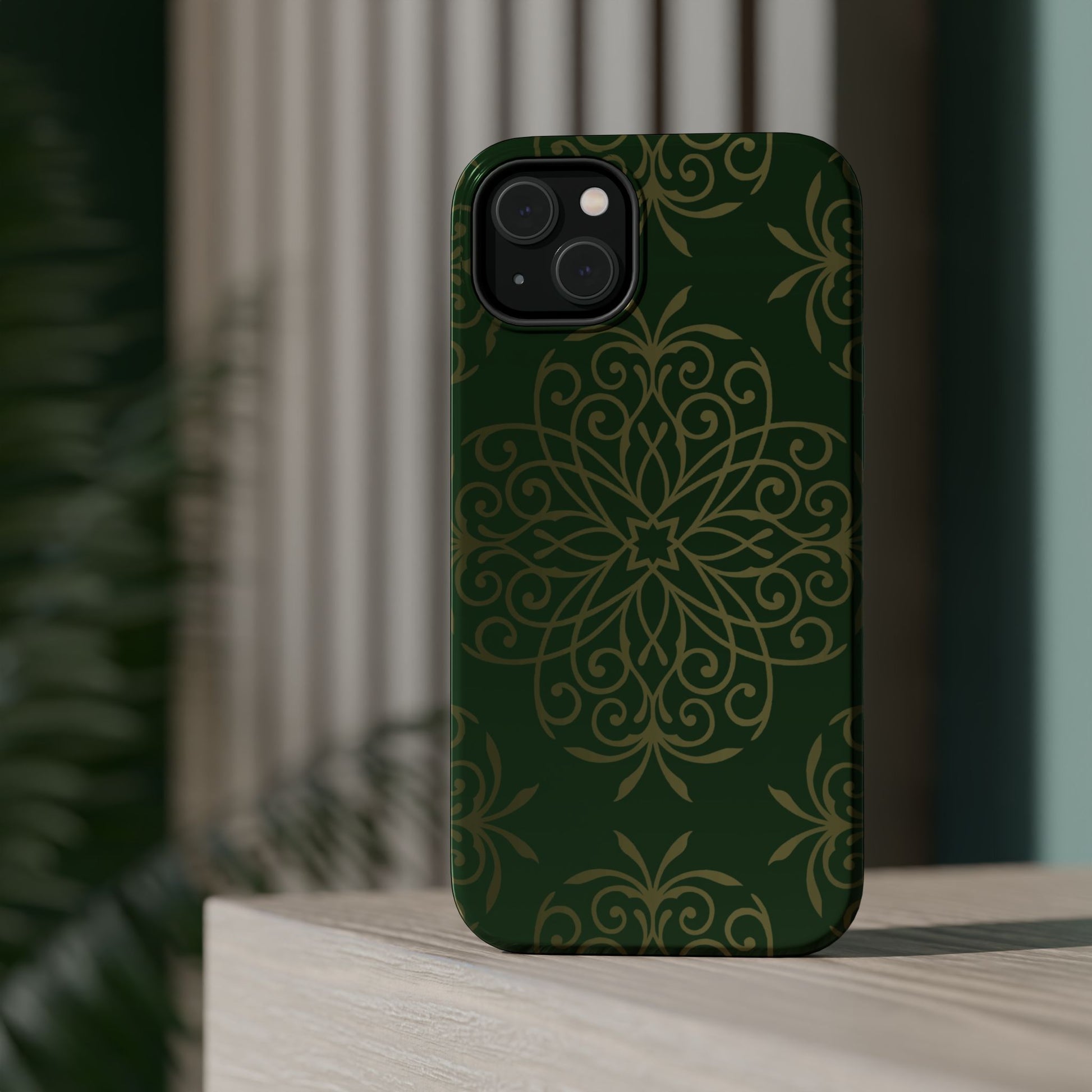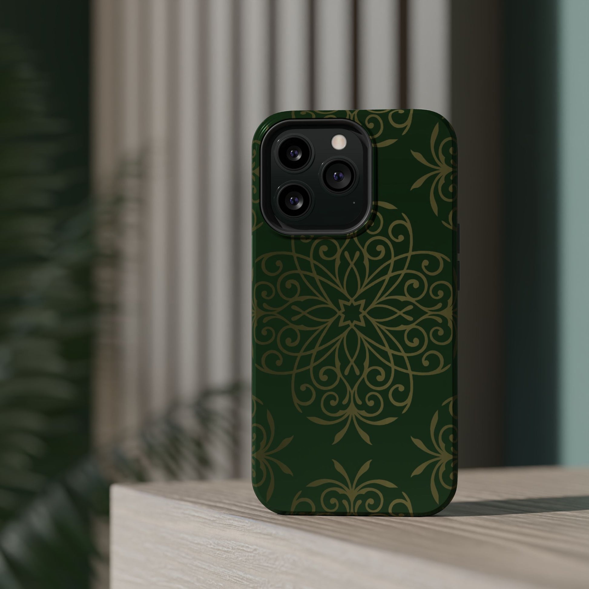 Gold and Green Flowery magnetic phone case. Equipped with an outer polycarbonate shell and inner black TPU lining, this case delivers robust protection thanks to its durable, flexible, impact-resistant nature. Available in a matte or glossy finish, each case comes with an embedded magnet module that is compatible with MagSafe® accessories and a stunning print that fully wraps around your case's exterior.