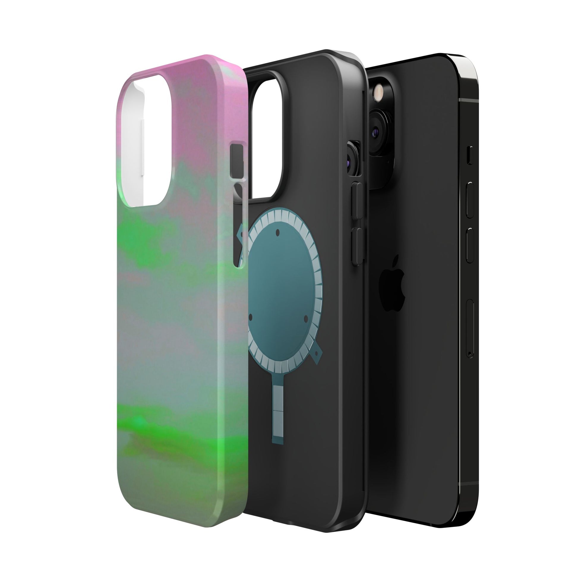 Green and Pink Sky magnetic phone case. Equipped with an outer polycarbonate shell and inner black TPU lining, this case delivers robust protection thanks to its durable, flexible, impact-resistant nature. Available in a matte or glossy finish, each case comes with an embedded magnet module that is compatible with MagSafe® accessories and a stunning print that fully wraps around your case's exterior.