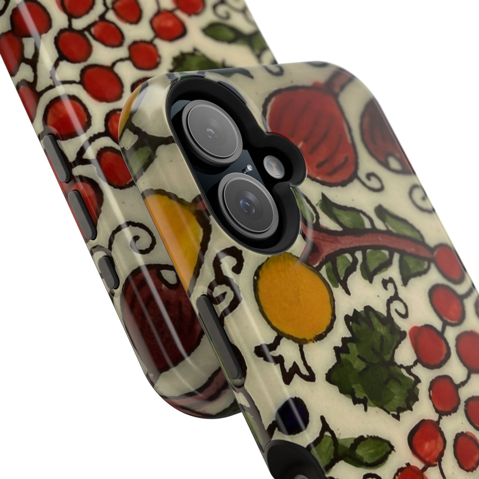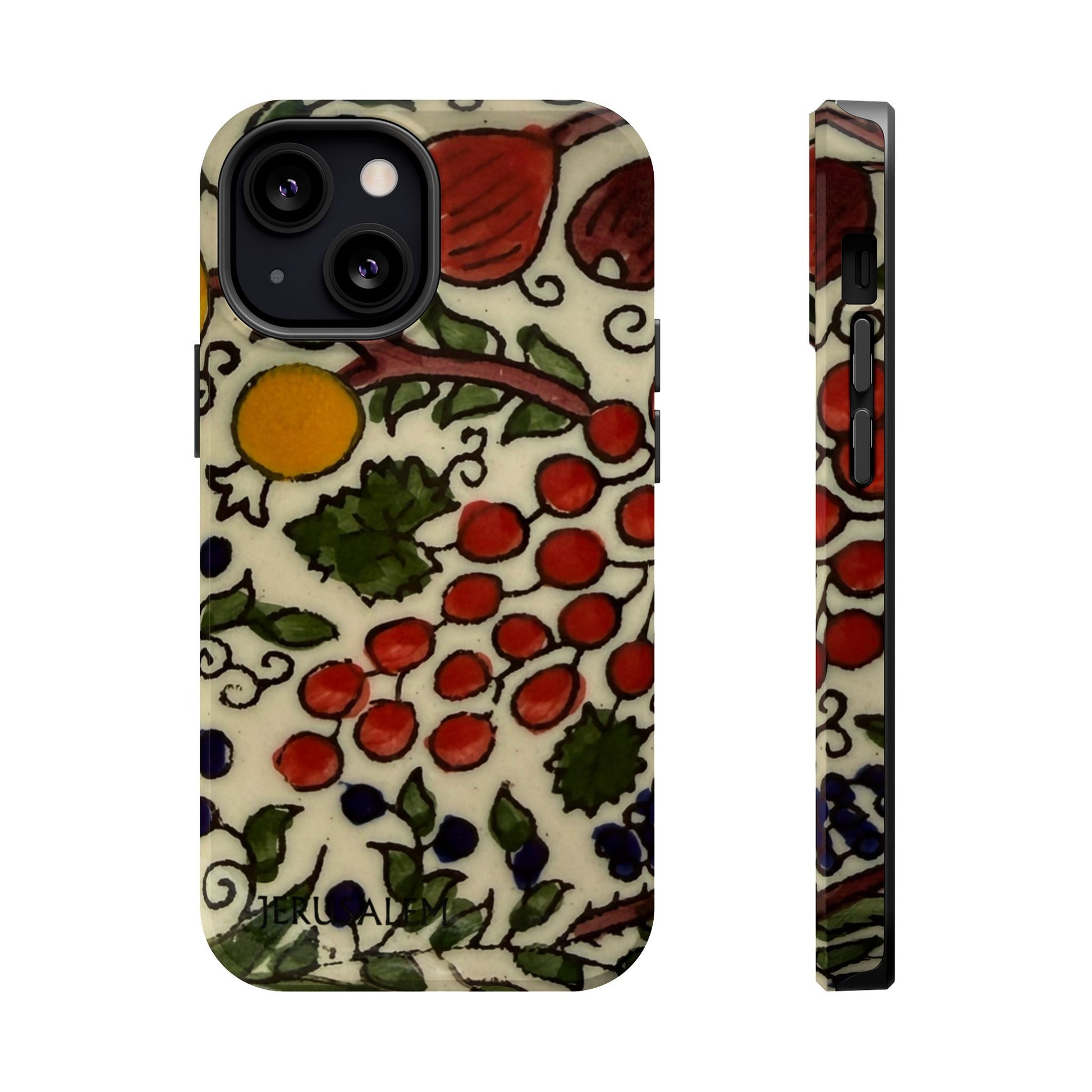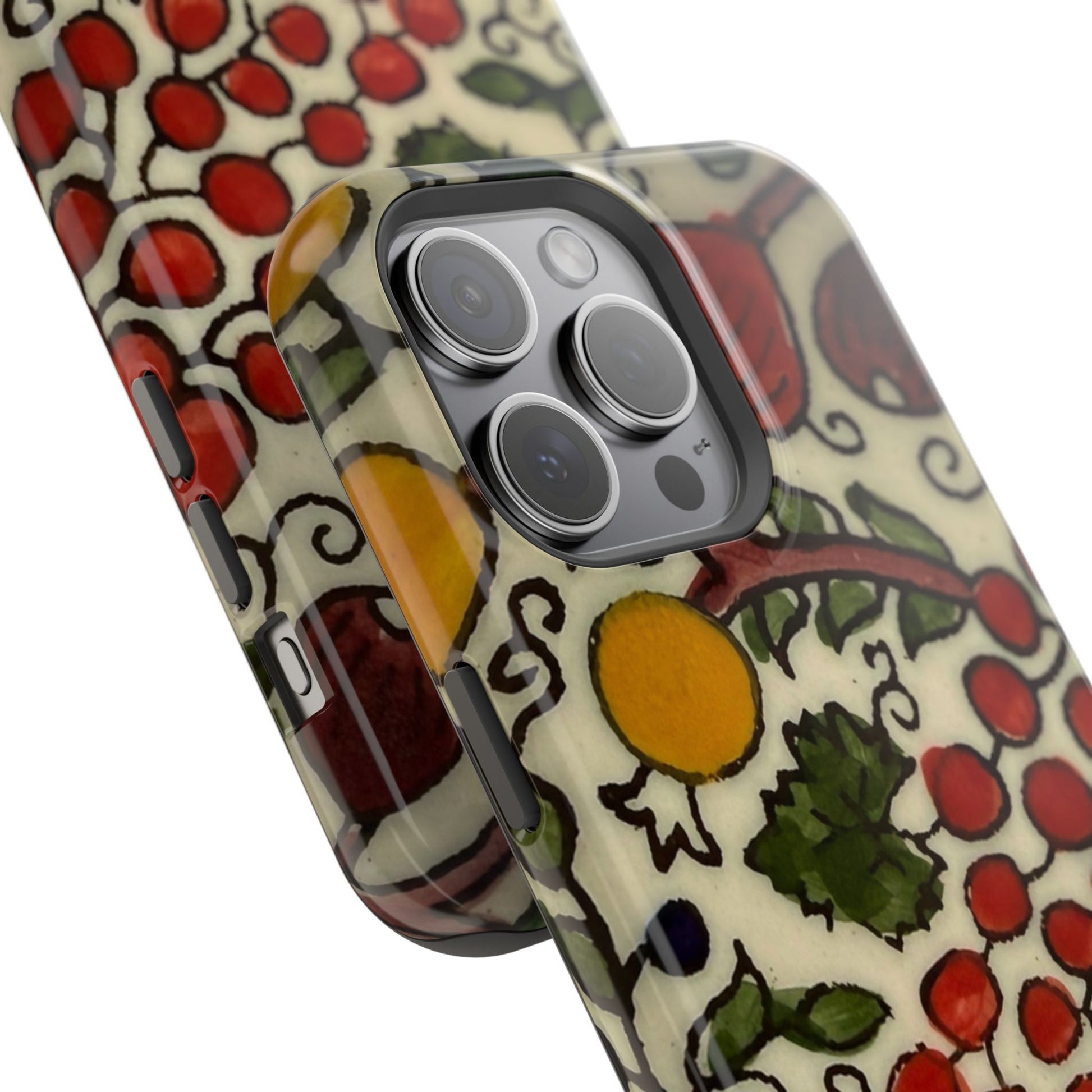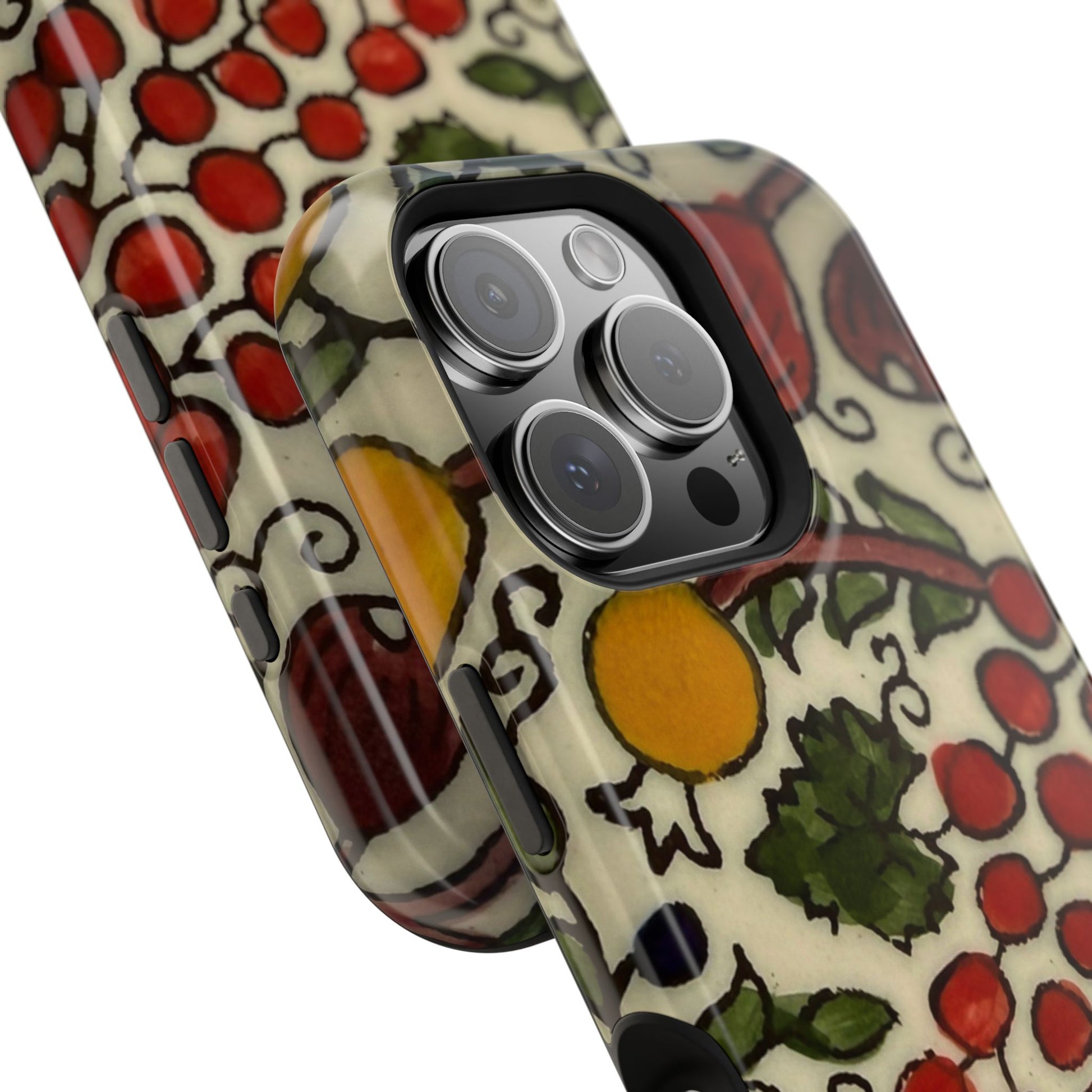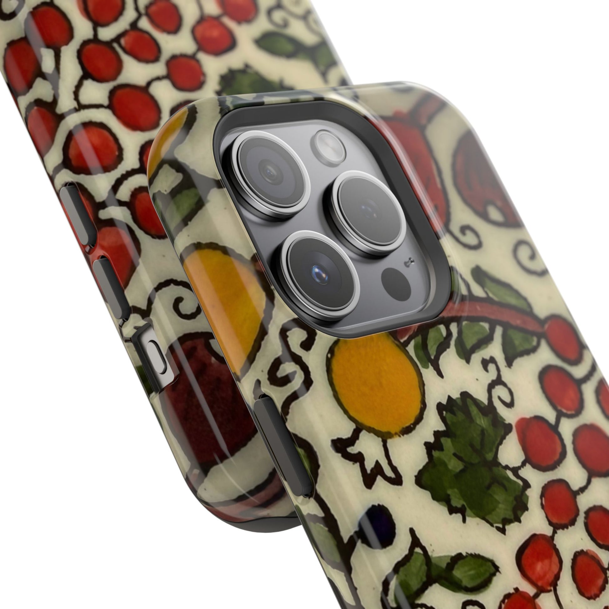 Jerusalem City Fruits magnetic phone case. Equipped with an outer polycarbonate shell and inner black TPU lining, this case delivers robust protection thanks to its durable, flexible, impact-resistant nature. Available in a matte or glossy finish, each case comes with an embedded magnet module that is compatible with MagSafe® accessories and a stunning print that fully wraps around your case's exterior.