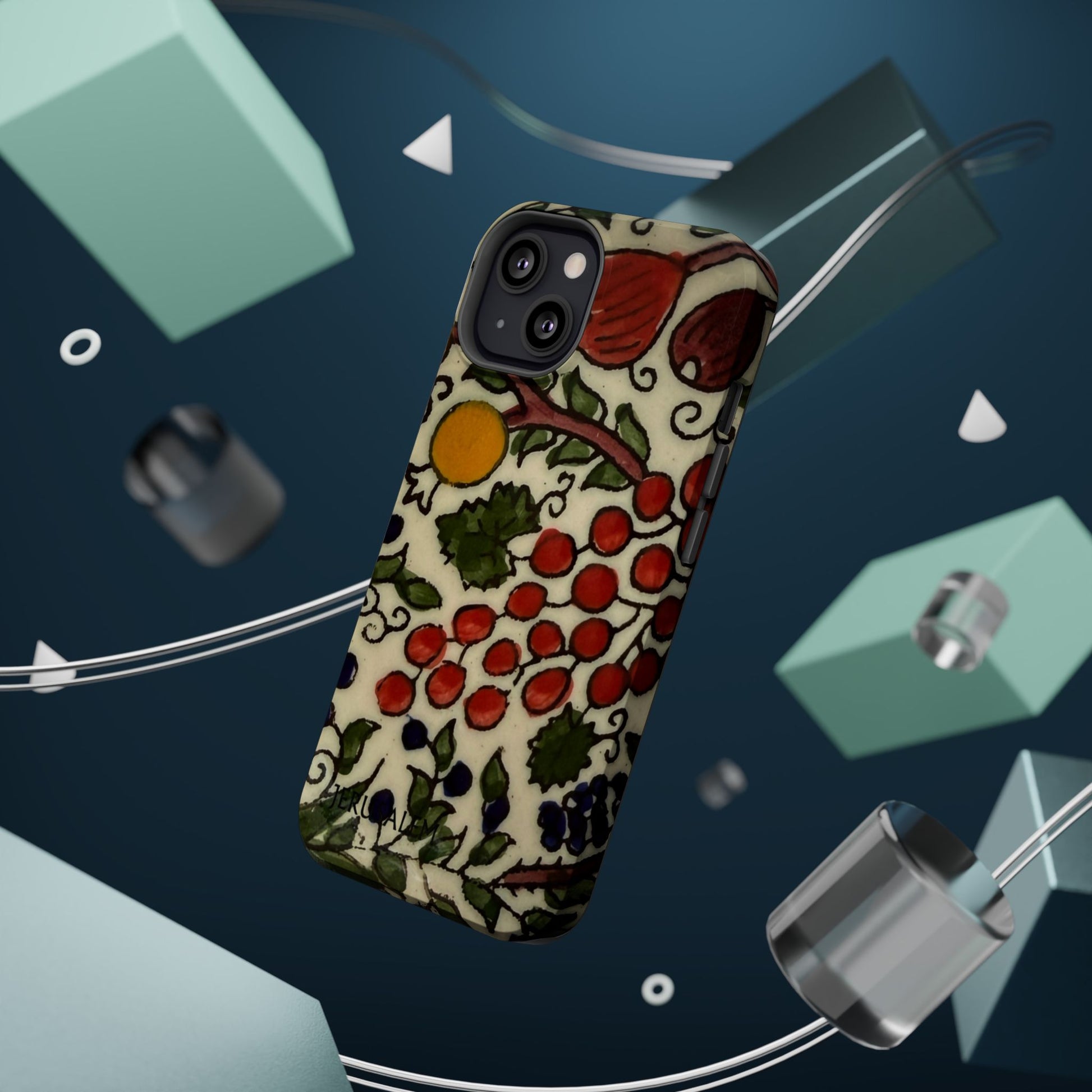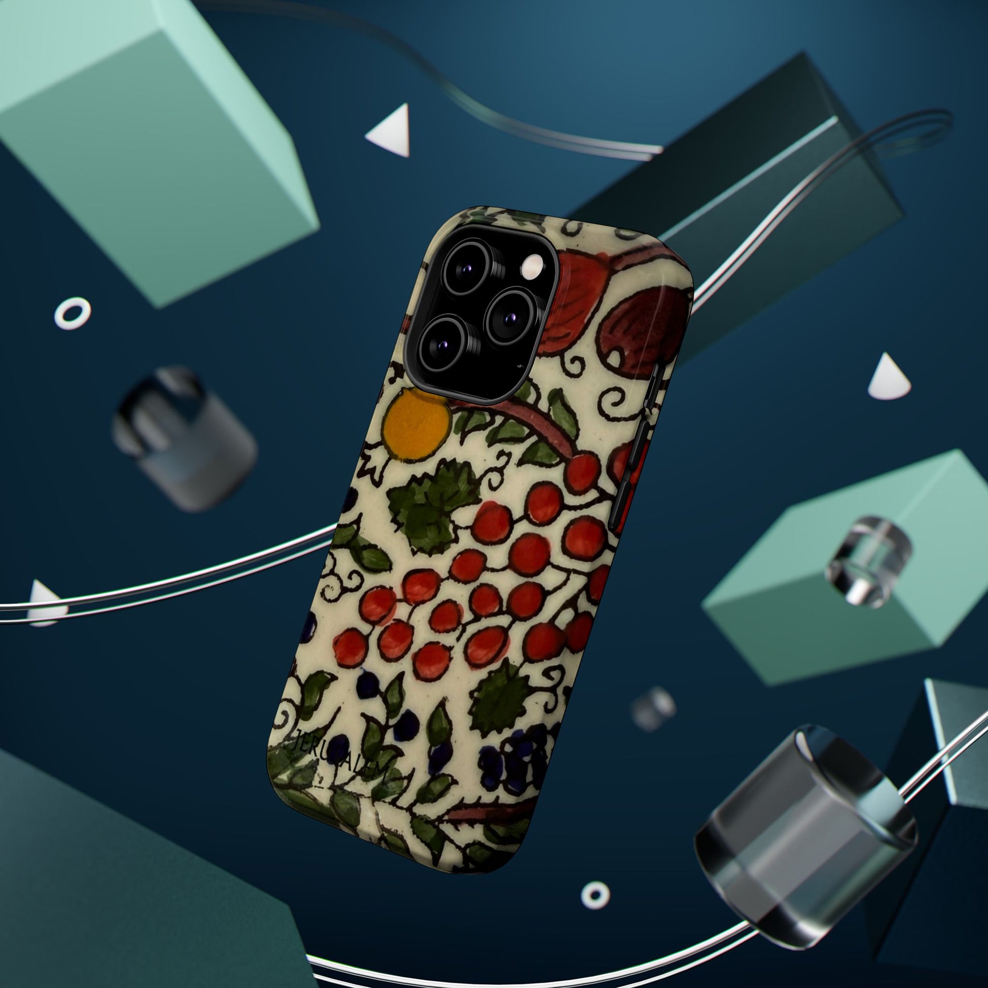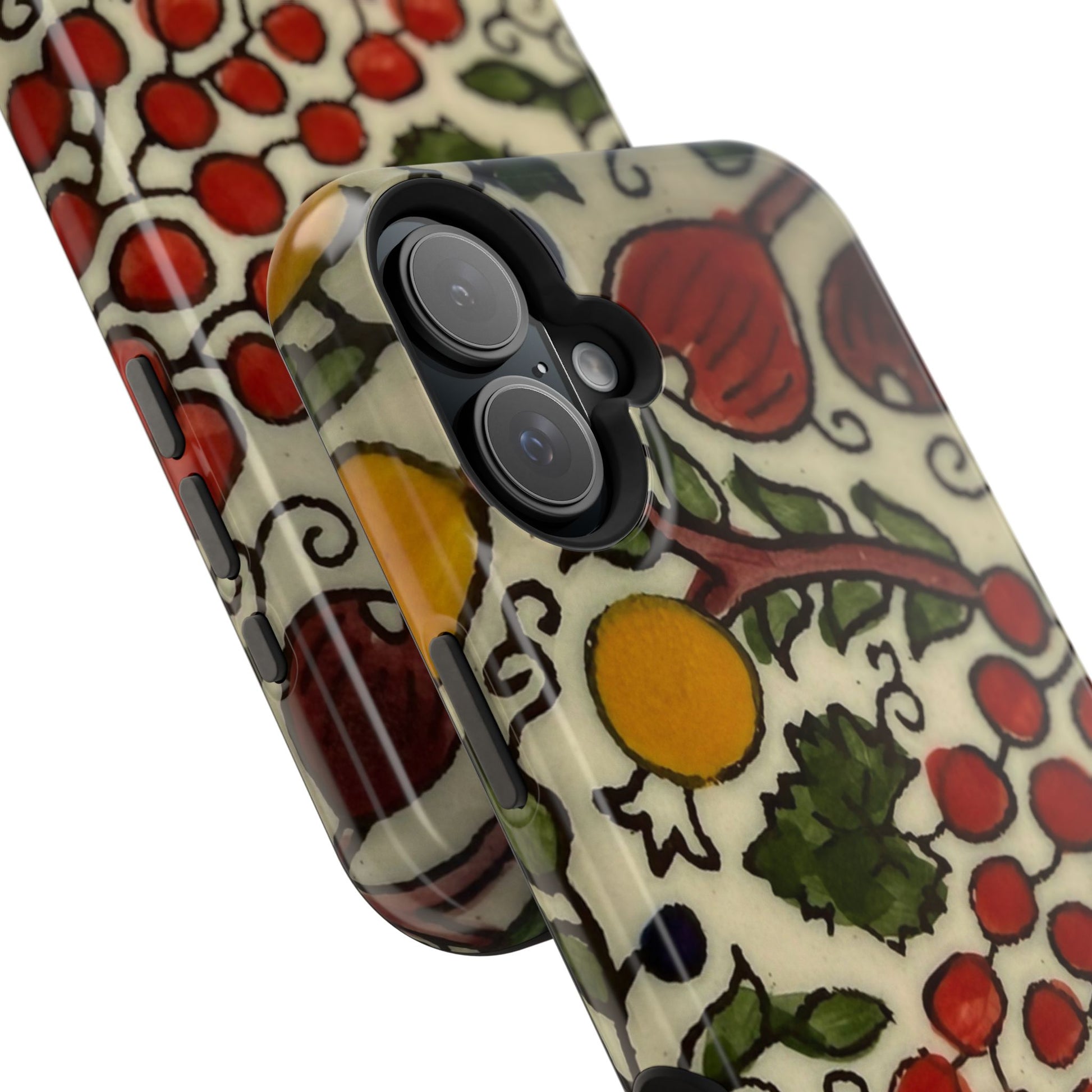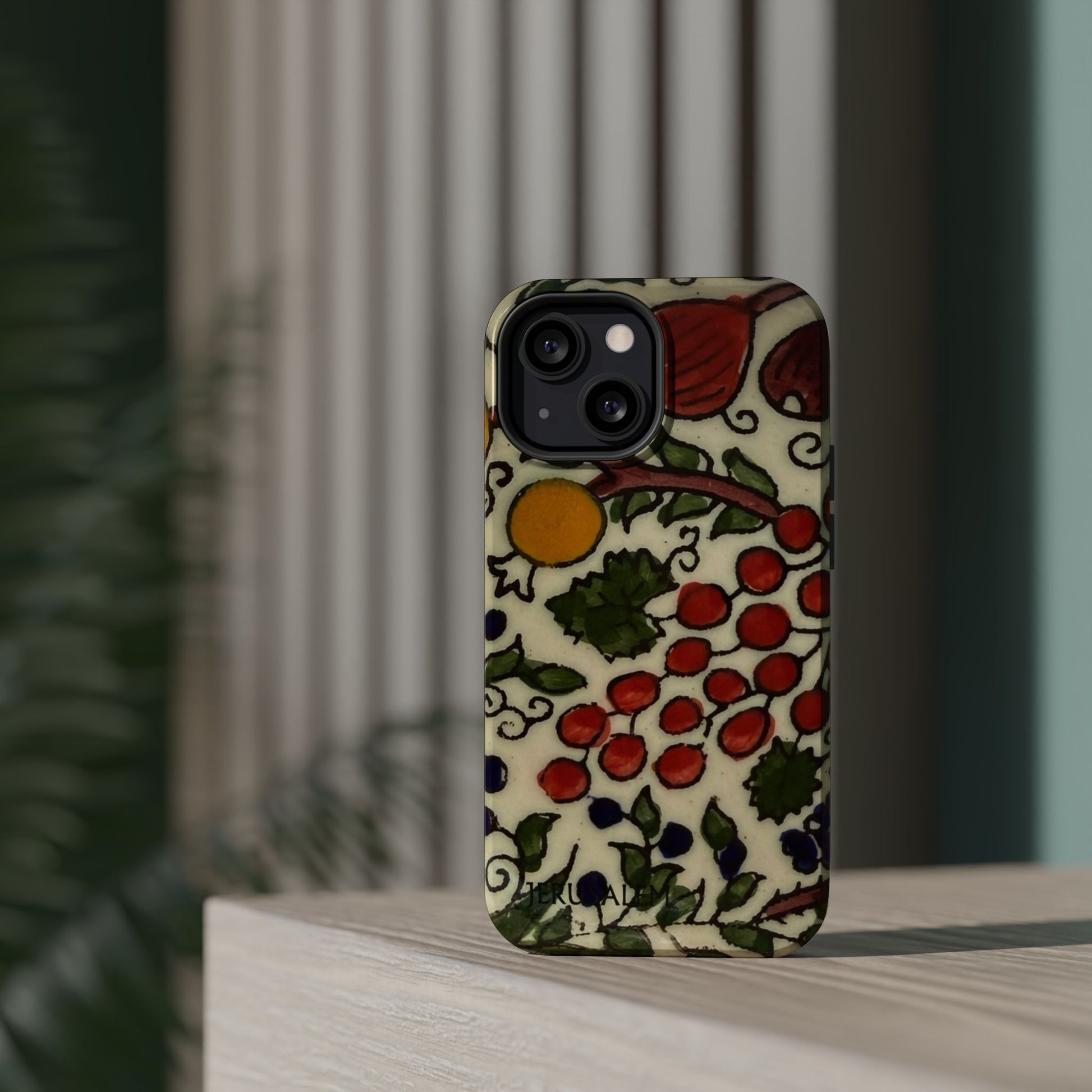Jerusalem City Fruits magnetic phone case. Equipped with an outer polycarbonate shell and inner black TPU lining, this case delivers robust protection thanks to its durable, flexible, impact-resistant nature. Available in a matte or glossy finish, each case comes with an embedded magnet module that is compatible with MagSafe® accessories and a stunning print that fully wraps around your case's exterior.