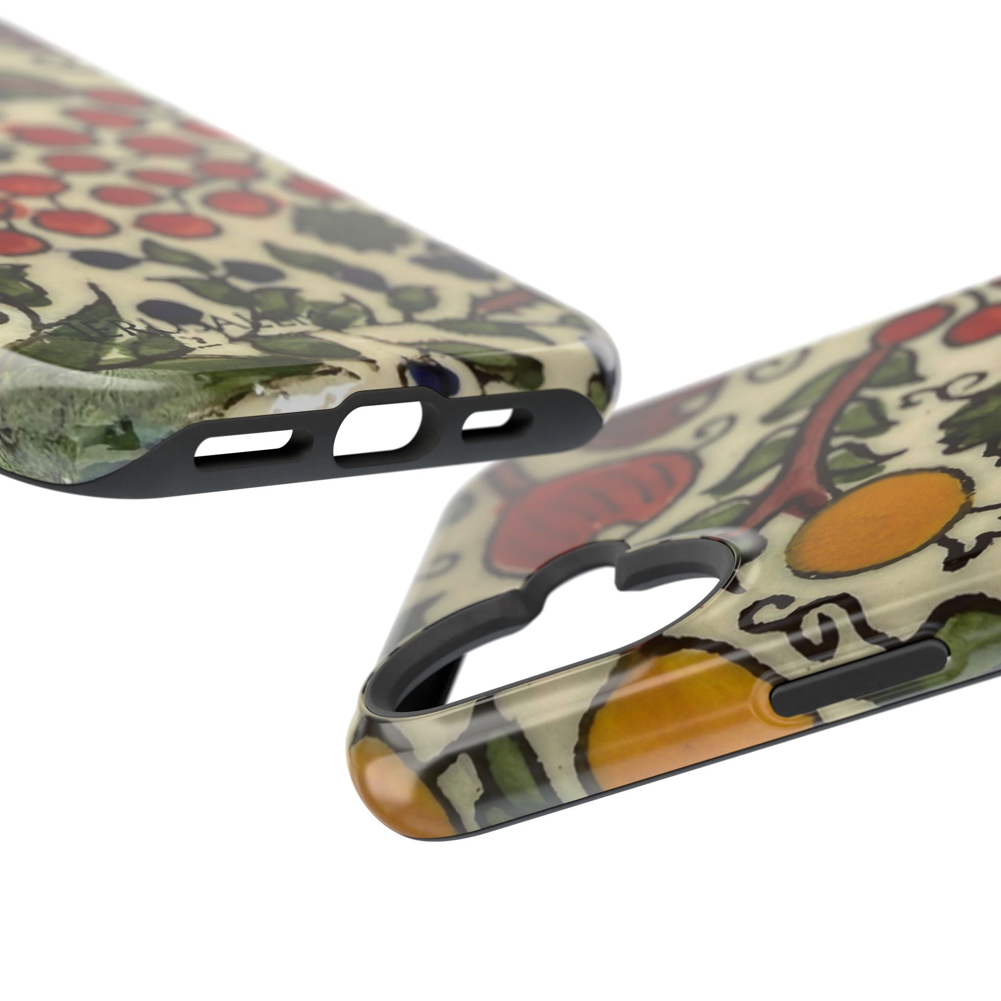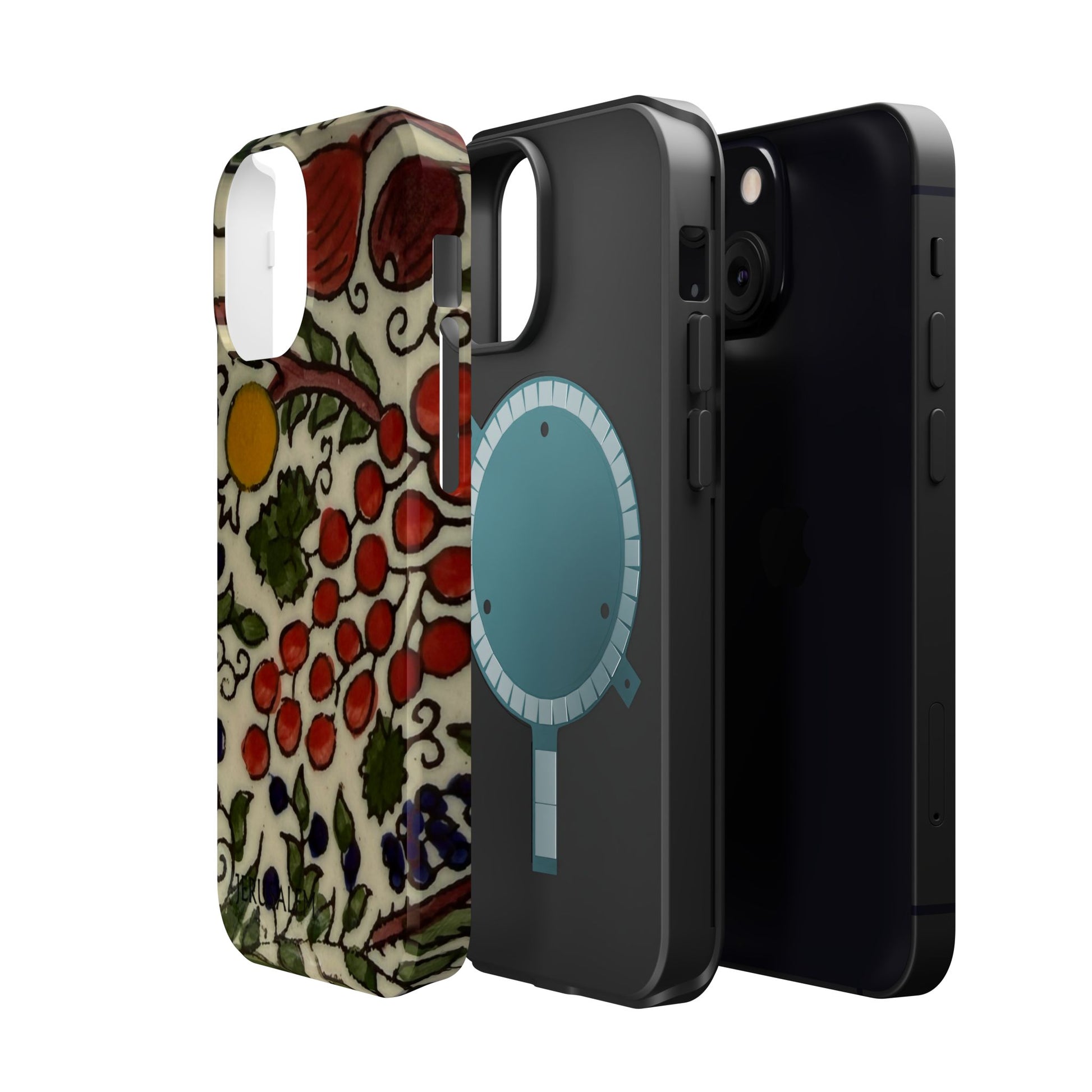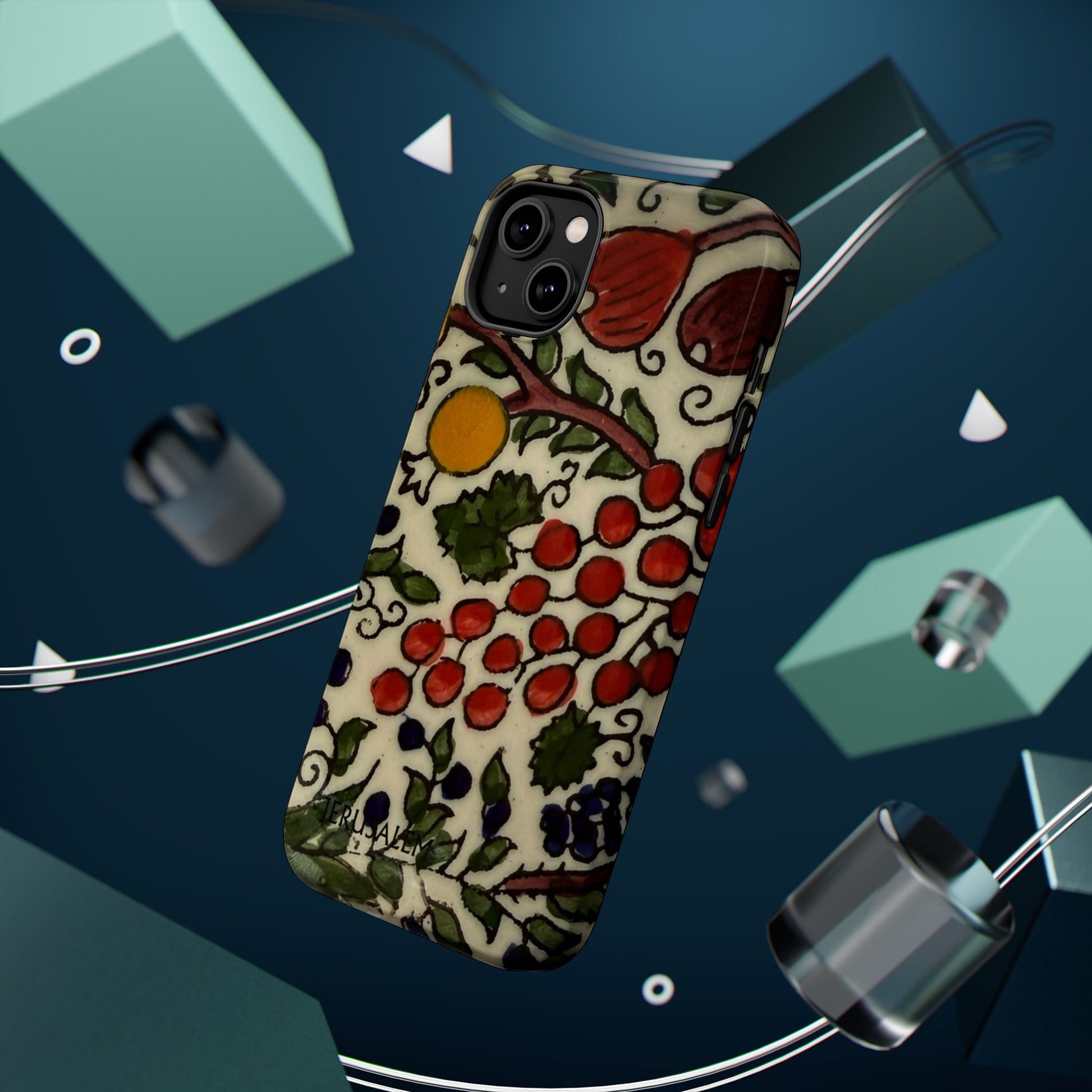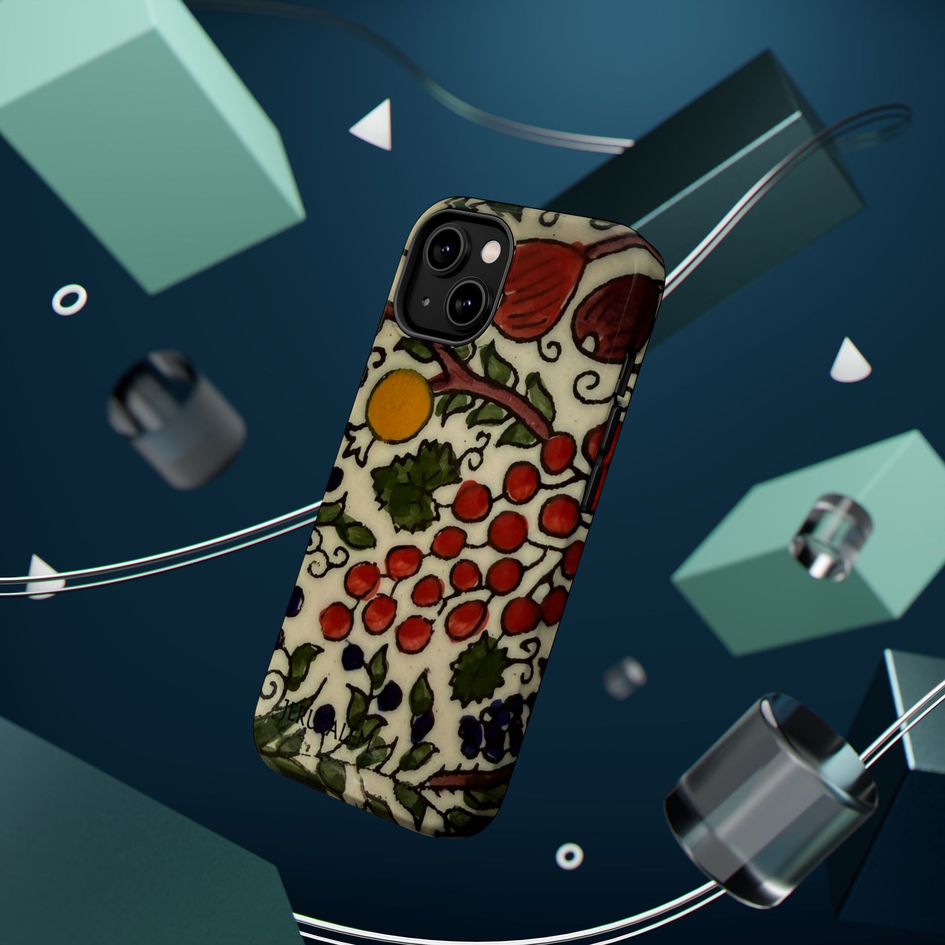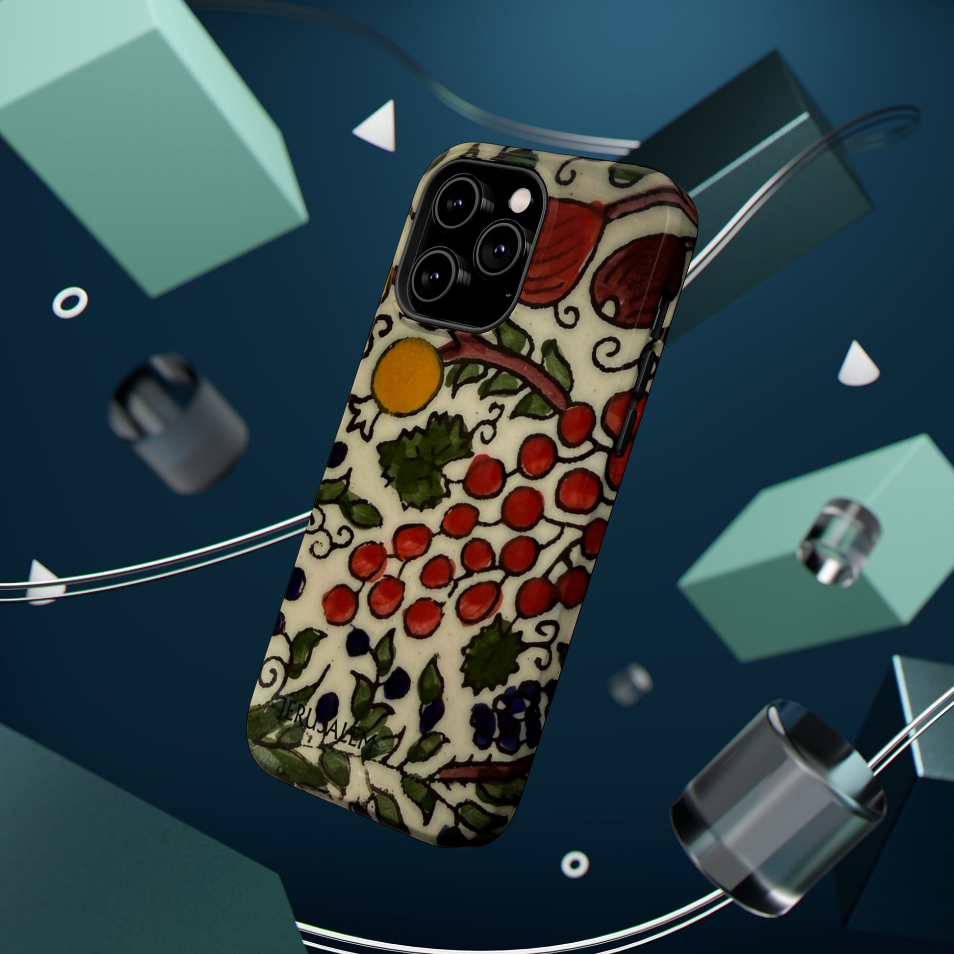 Jerusalem City Fruits magnetic phone case. Equipped with an outer polycarbonate shell and inner black TPU lining, this case delivers robust protection thanks to its durable, flexible, impact-resistant nature. Available in a matte or glossy finish, each case comes with an embedded magnet module that is compatible with MagSafe® accessories and a stunning print that fully wraps around your case's exterior.