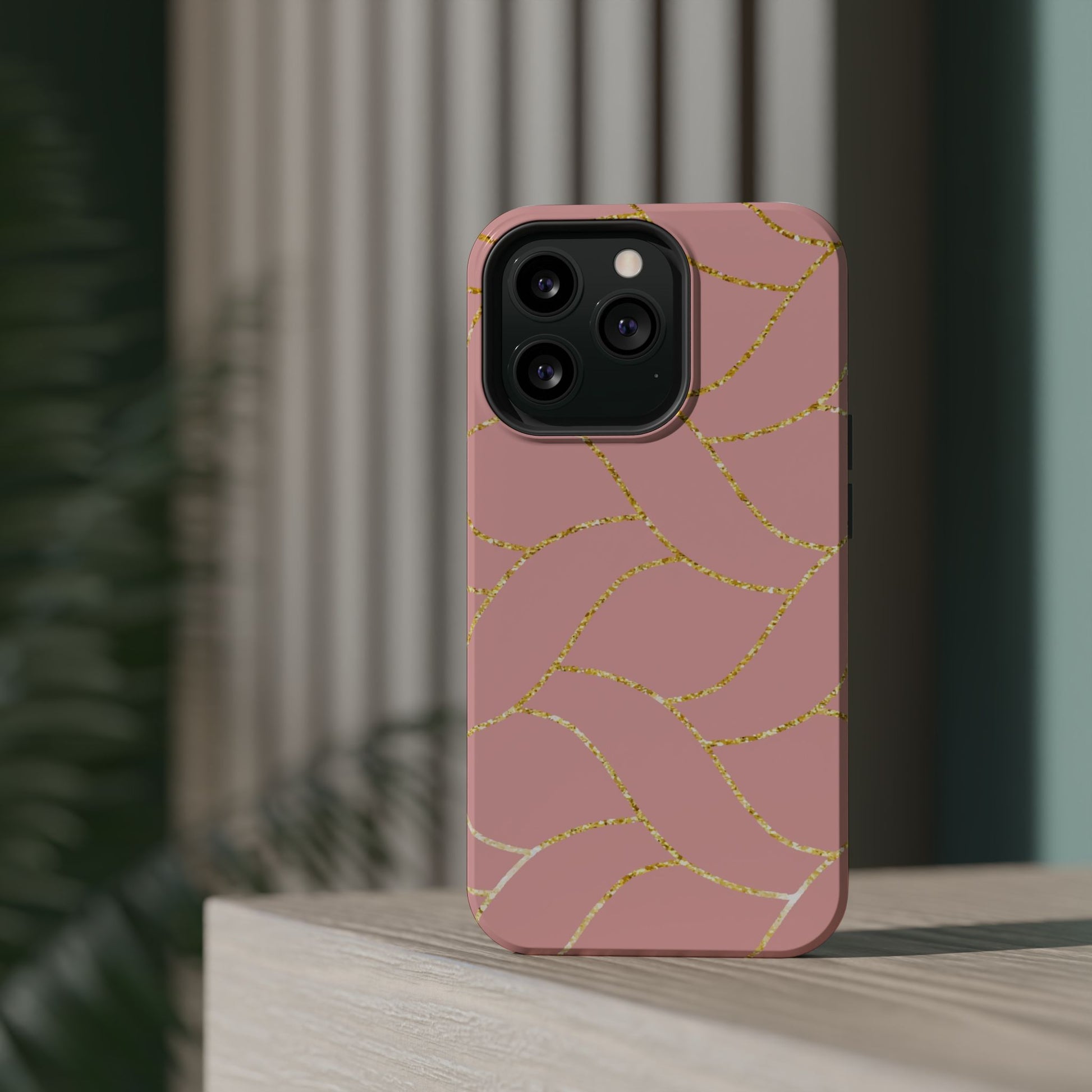 Pink and Gold geometric magnetic phone case. Equipped with an outer polycarbonate shell and inner black TPU lining, this case delivers robust protection thanks to its durable, flexible, impact-resistant nature. Available in a matte or glossy finish, each case comes with an embedded magnet module that is compatible with MagSafe® accessories and a stunning print that fully wraps around your case's exterior.