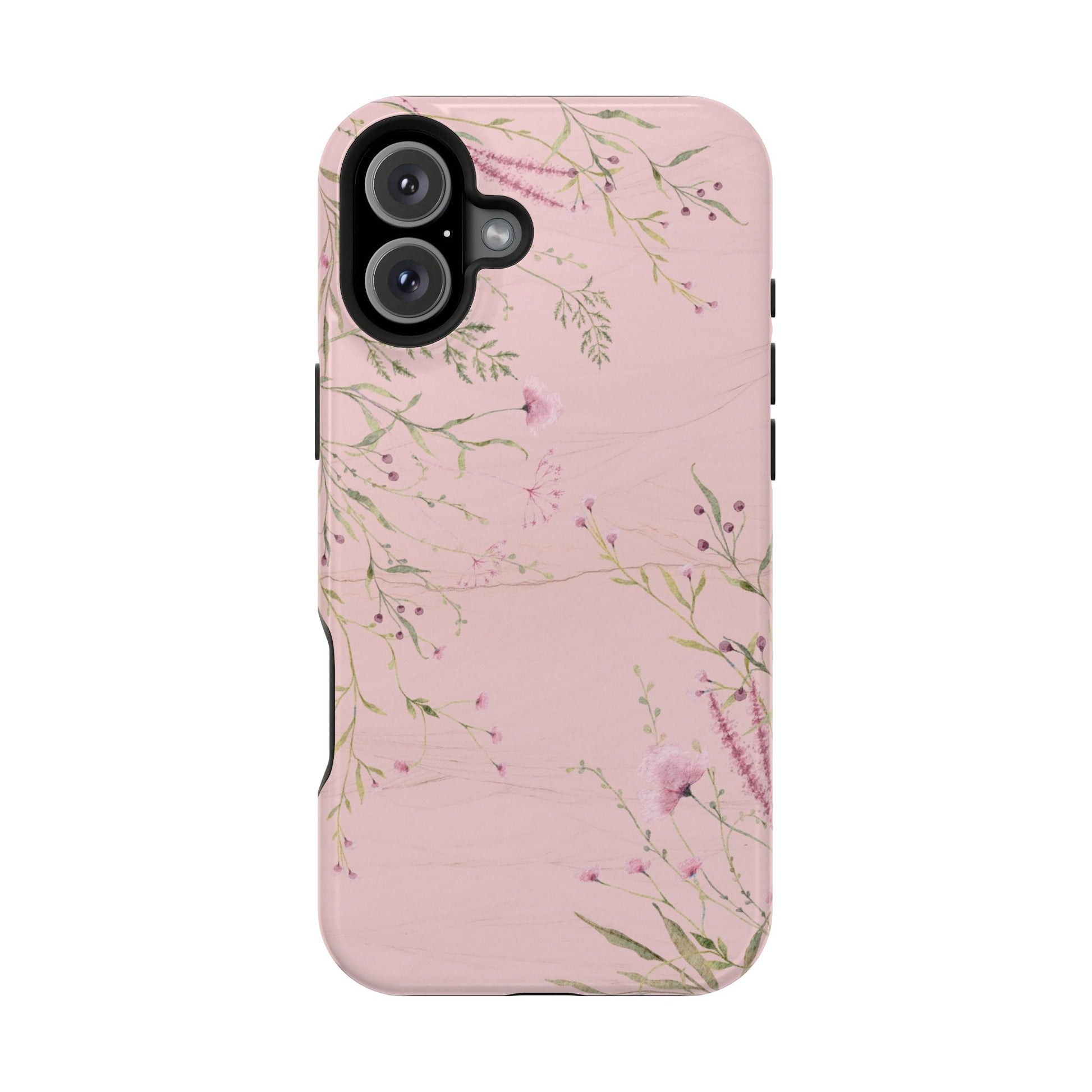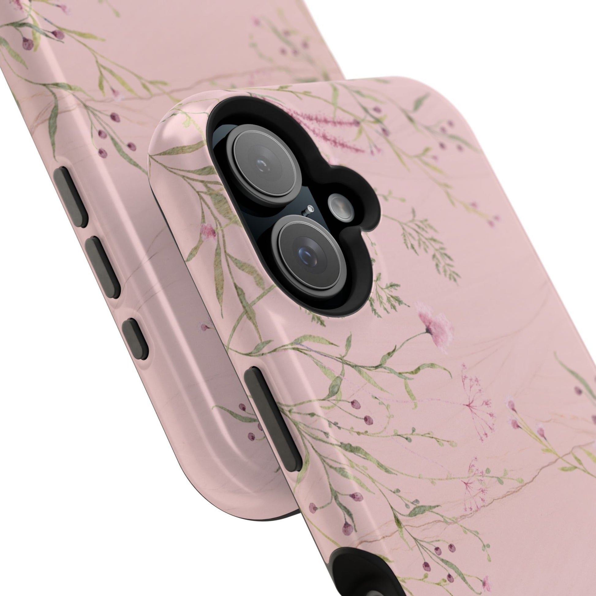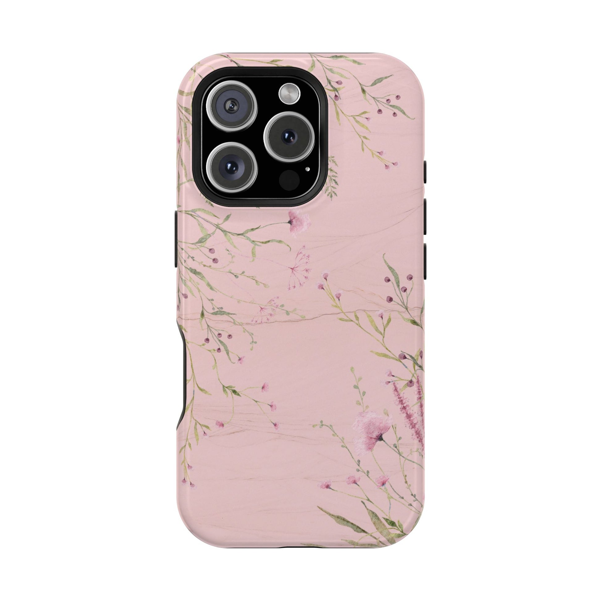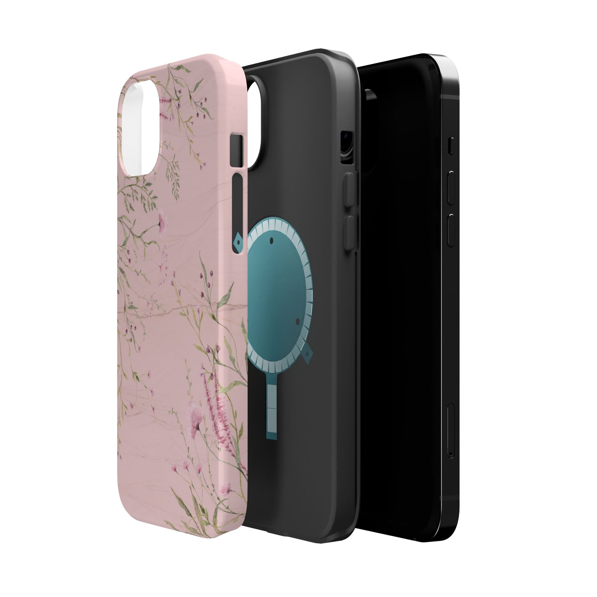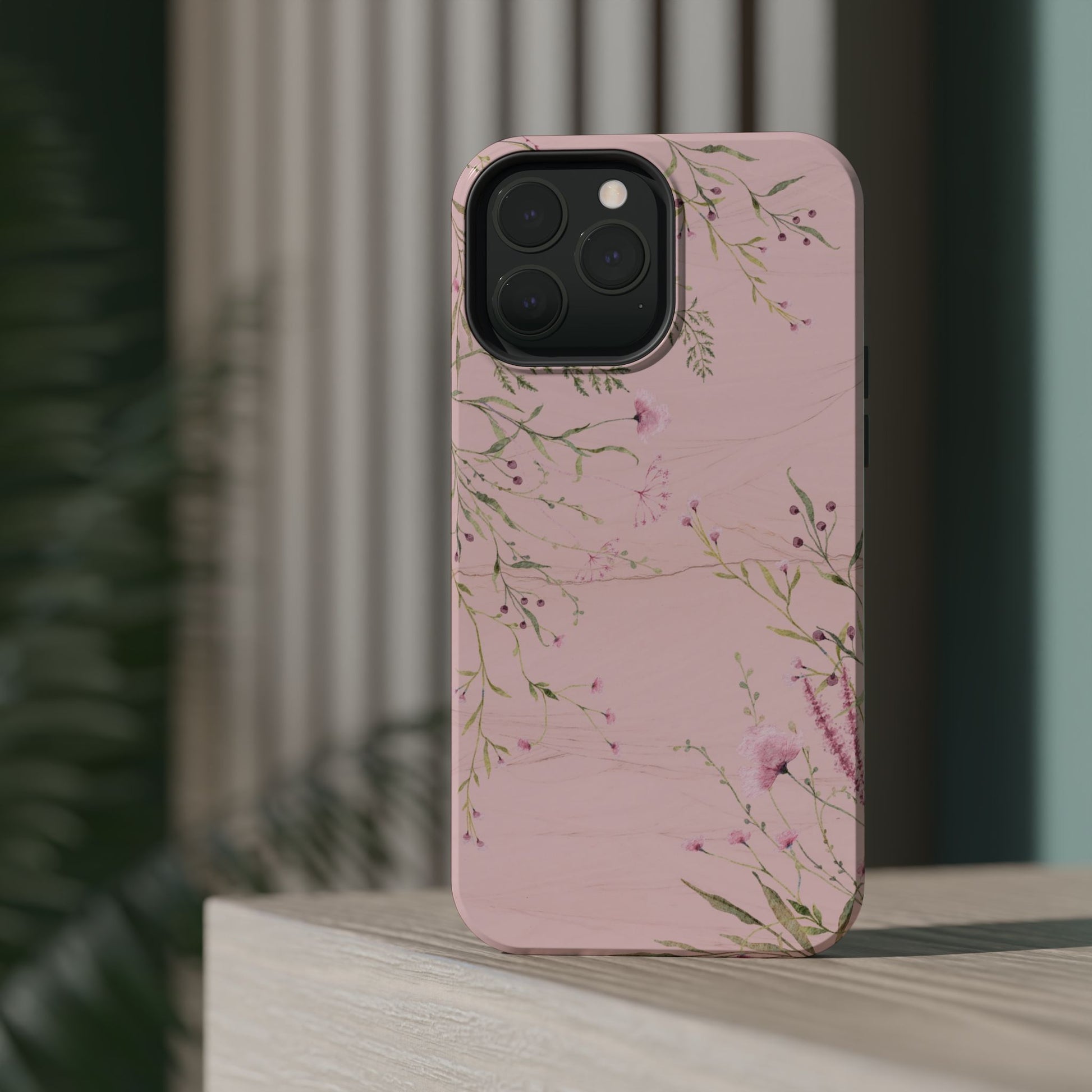 Pink spring magnetic phone case. Equipped with an outer polycarbonate shell and inner black TPU lining, this case delivers robust protection thanks to its durable, flexible, impact-resistant nature. Available in a matte or glossy finish, each case comes with an embedded magnet module that is compatible with MagSafe® accessories and a stunning print that fully wraps around your case's exterior.