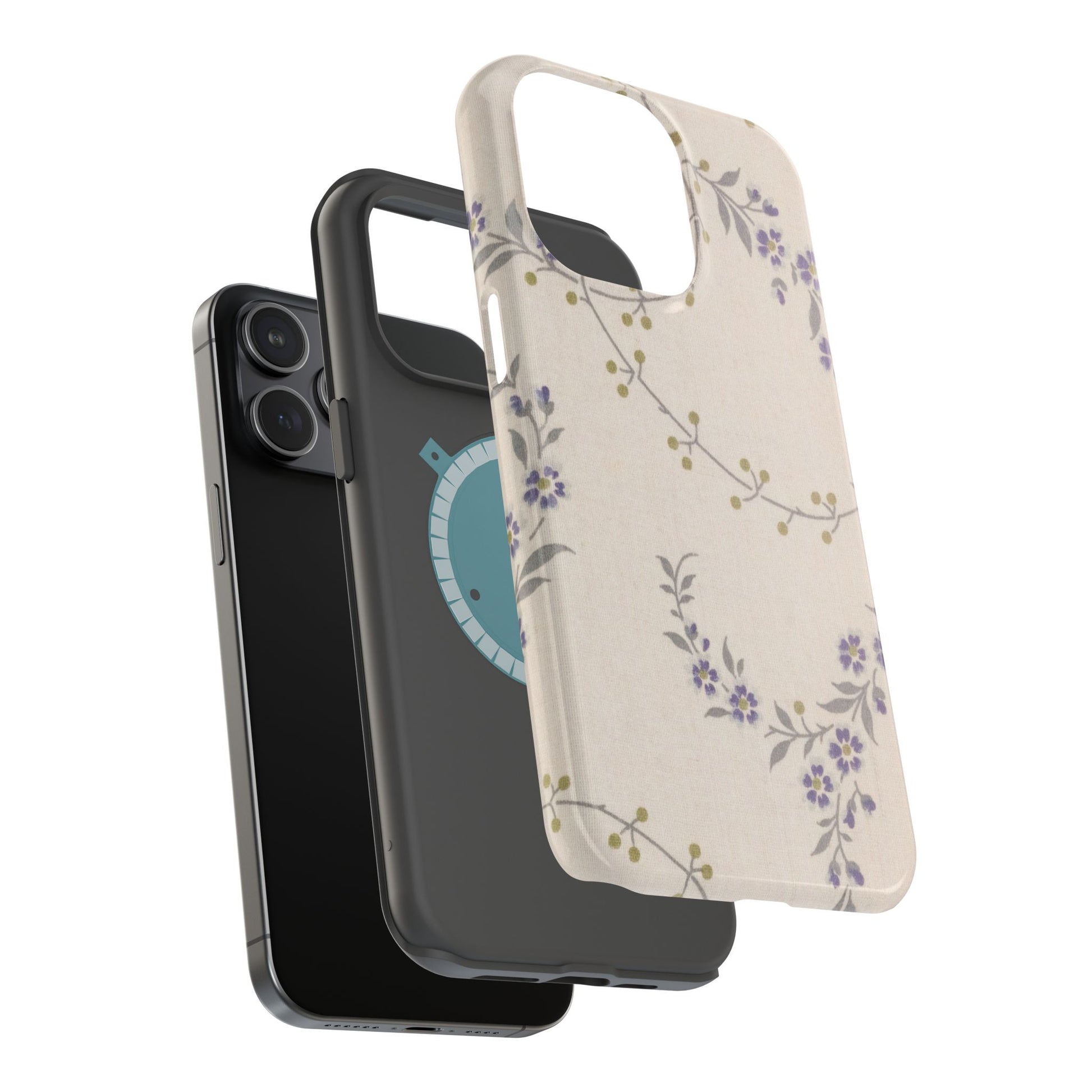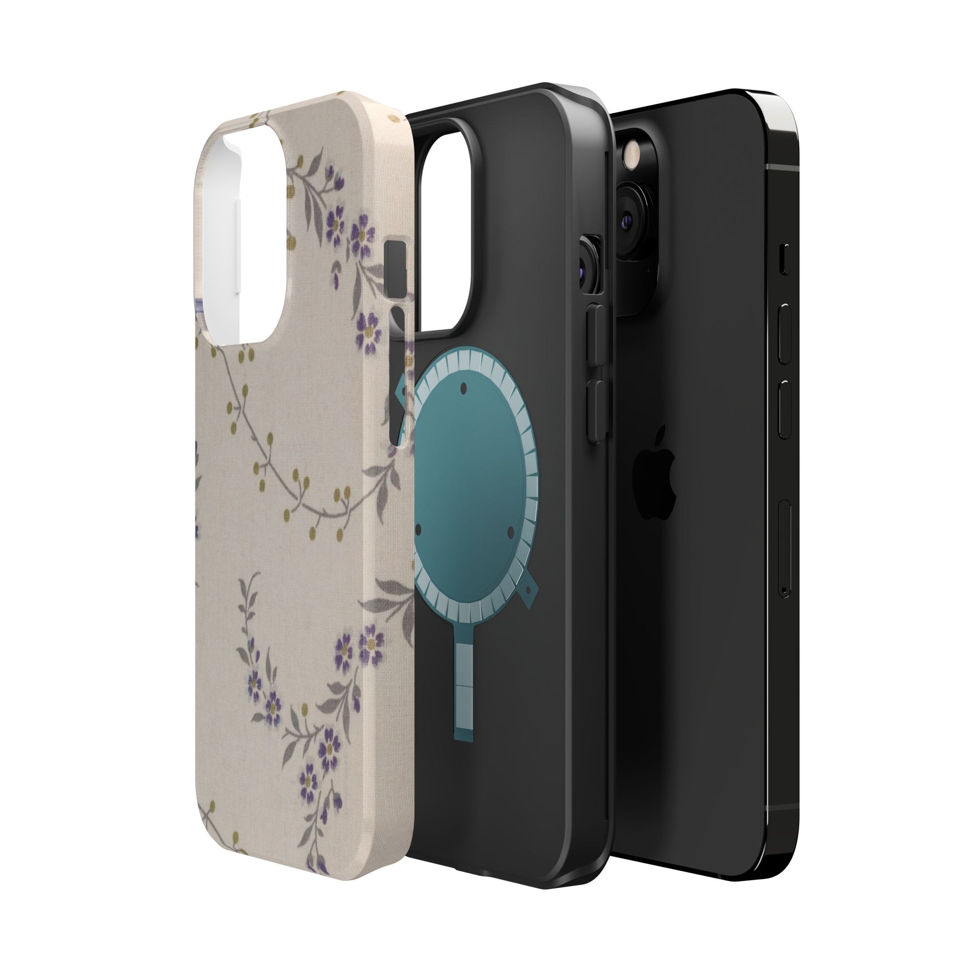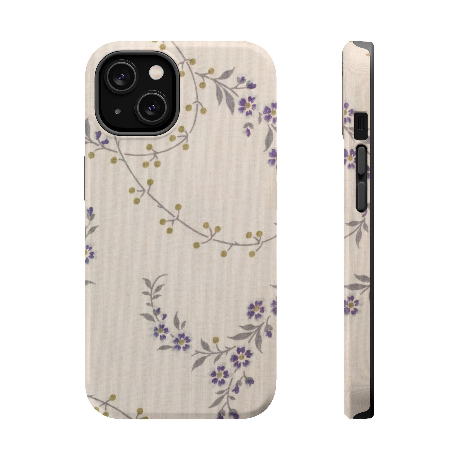 Purple floral magnetic phone case. Equipped with an outer polycarbonate shell and inner black TPU lining, this case delivers robust protection thanks to its durable, flexible, impact-resistant nature. Available in a matte or glossy finish, each case comes with an embedded magnet module that is compatible with MagSafe® accessories and a stunning print that fully wraps around your case's exterior.