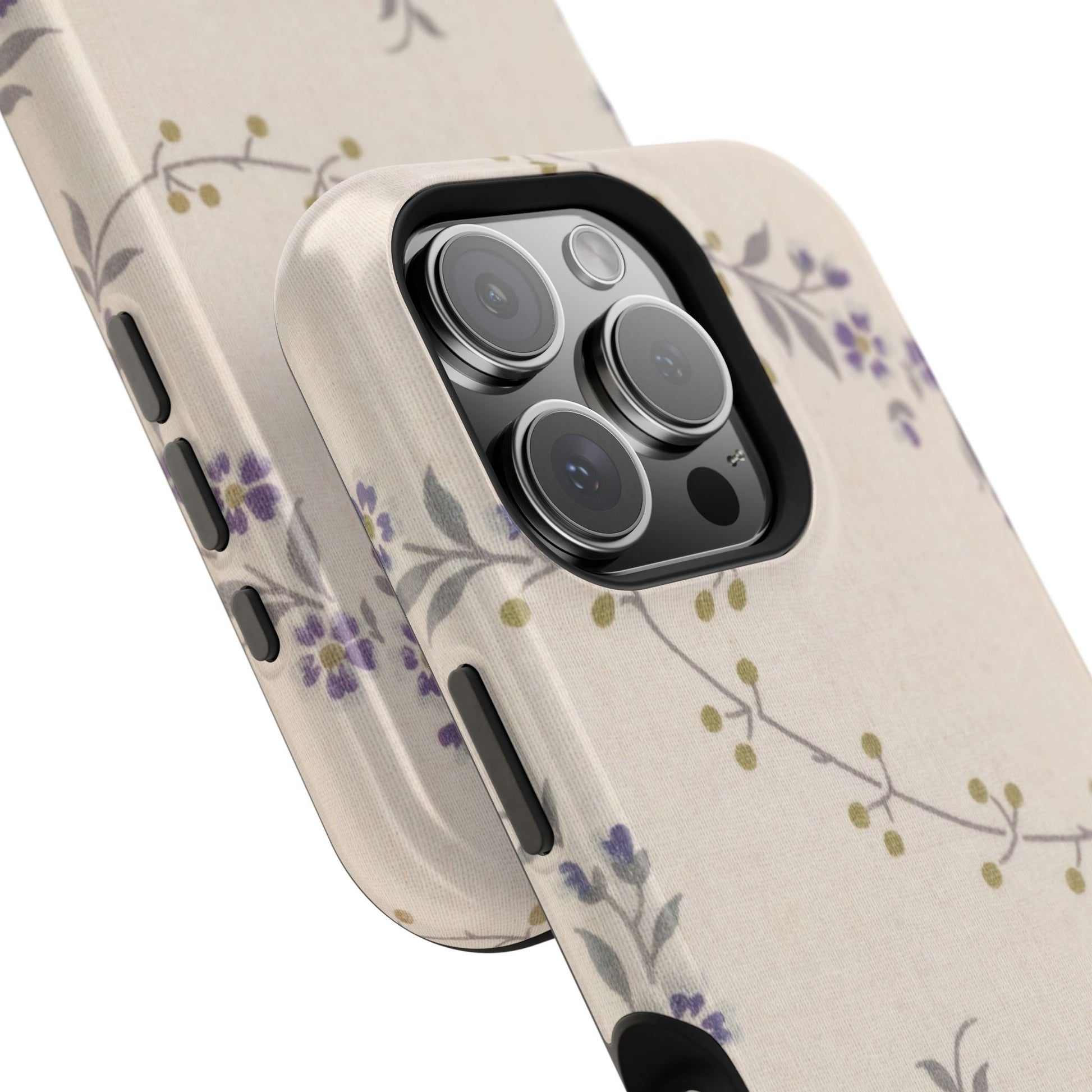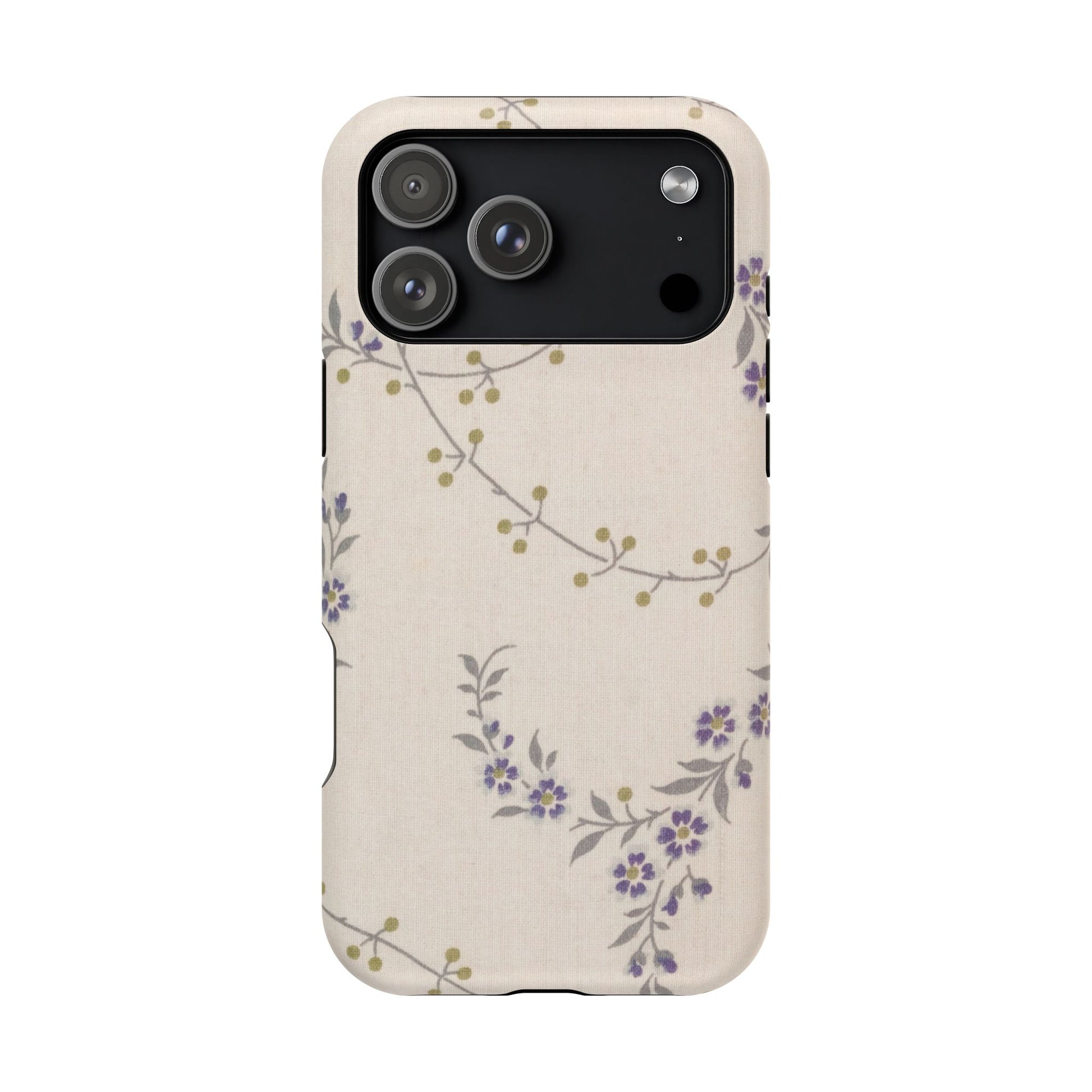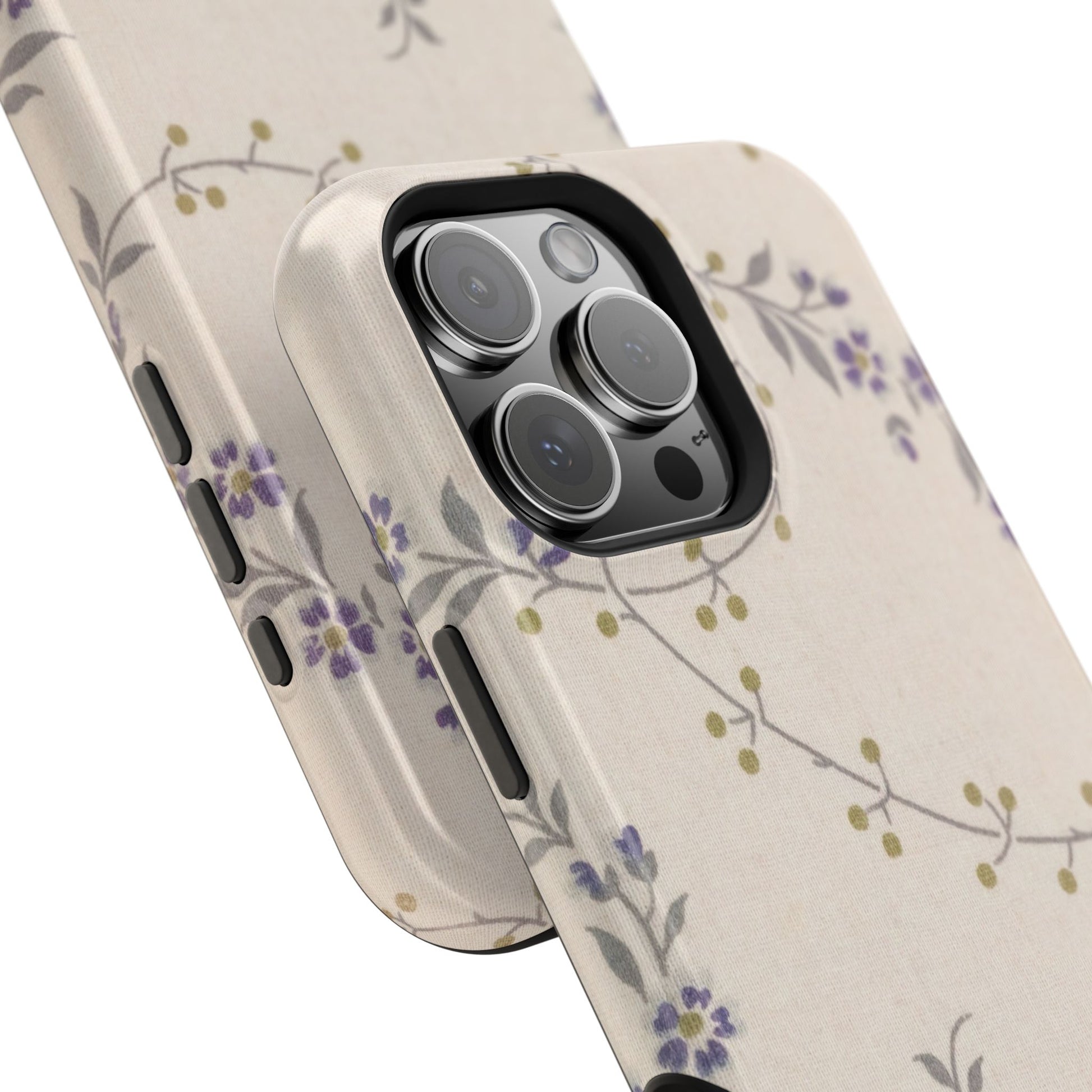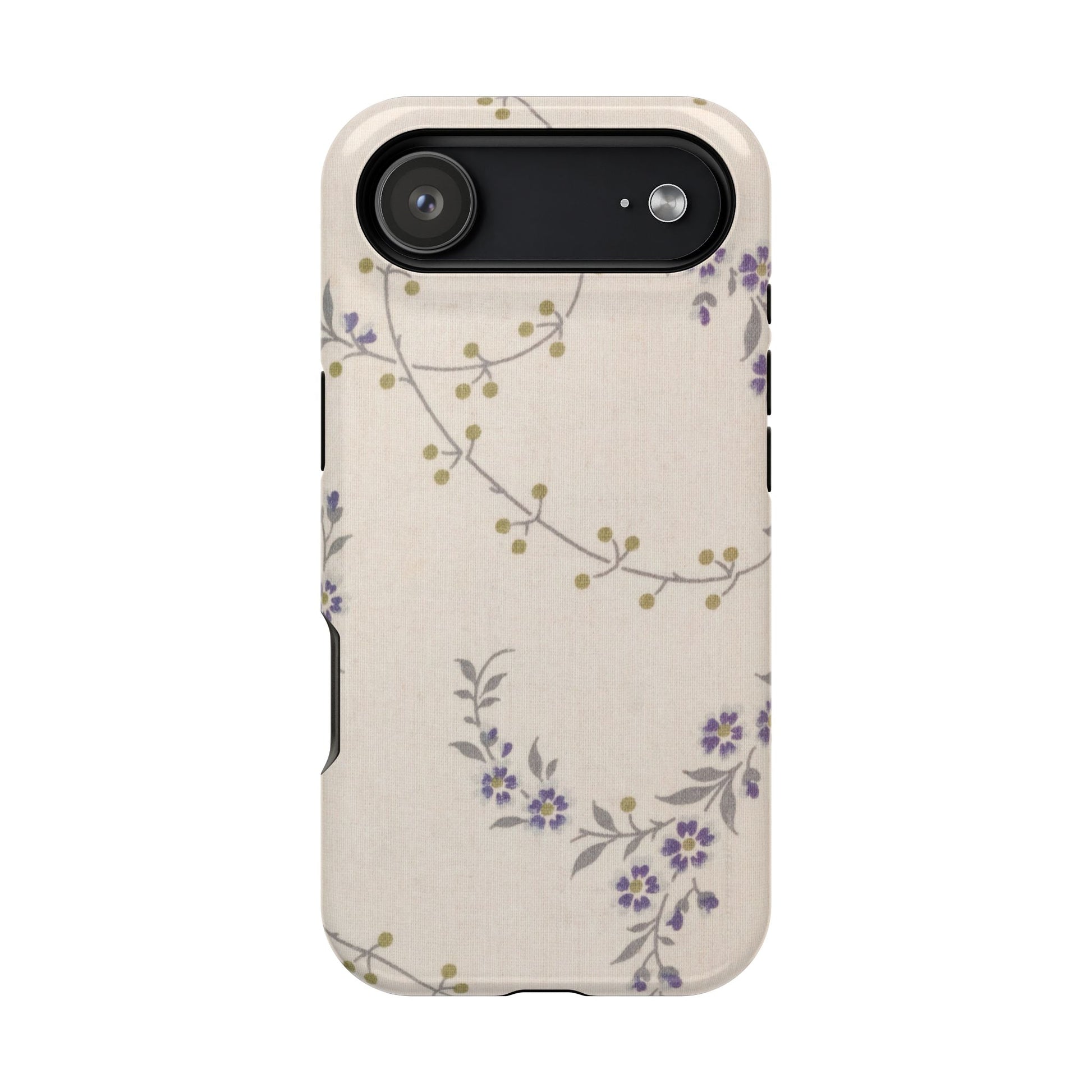 Purple floral magnetic phone case. Equipped with an outer polycarbonate shell and inner black TPU lining, this case delivers robust protection thanks to its durable, flexible, impact-resistant nature. Available in a matte or glossy finish, each case comes with an embedded magnet module that is compatible with MagSafe® accessories and a stunning print that fully wraps around your case's exterior.
