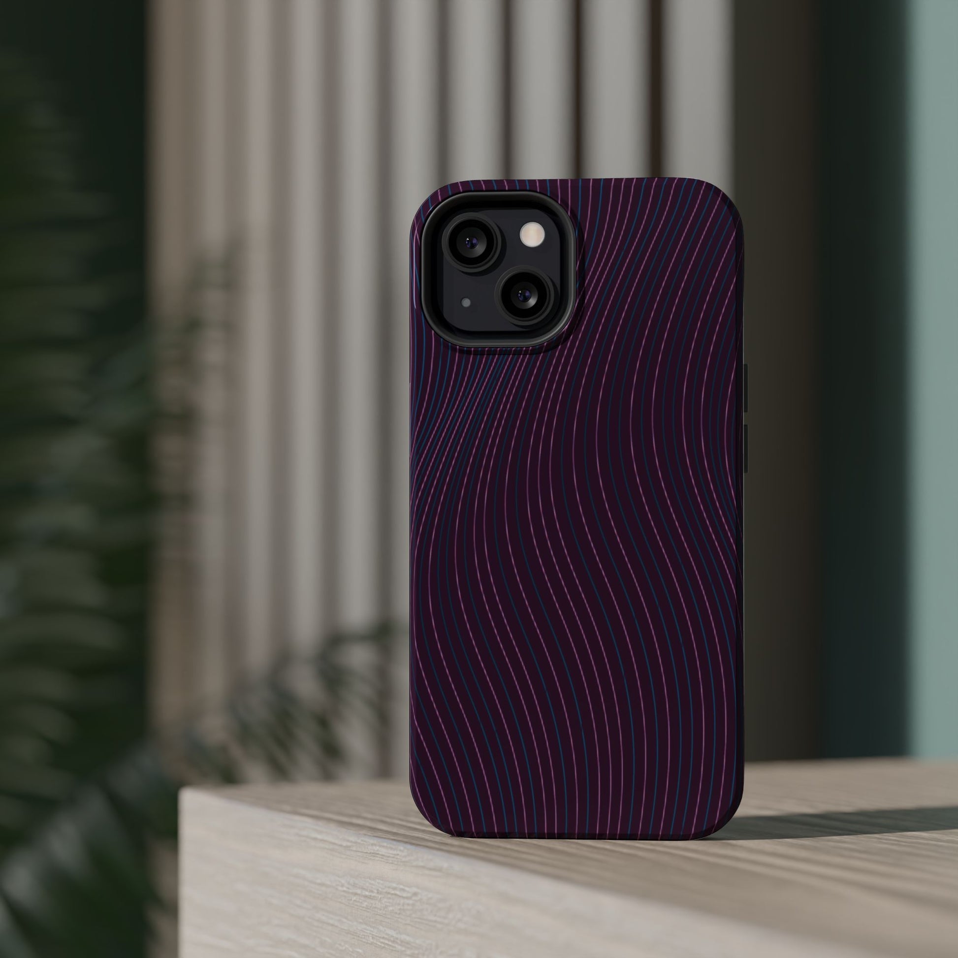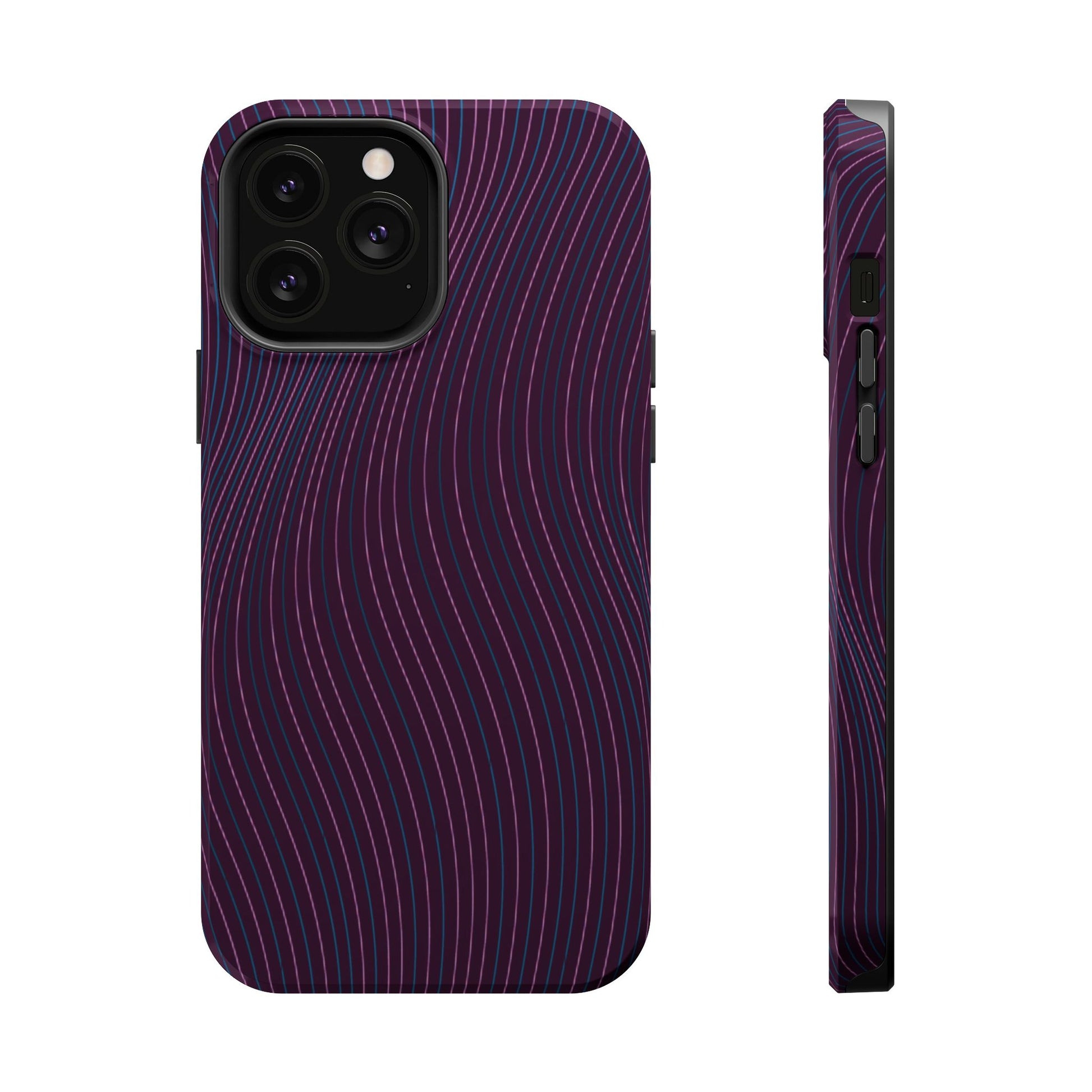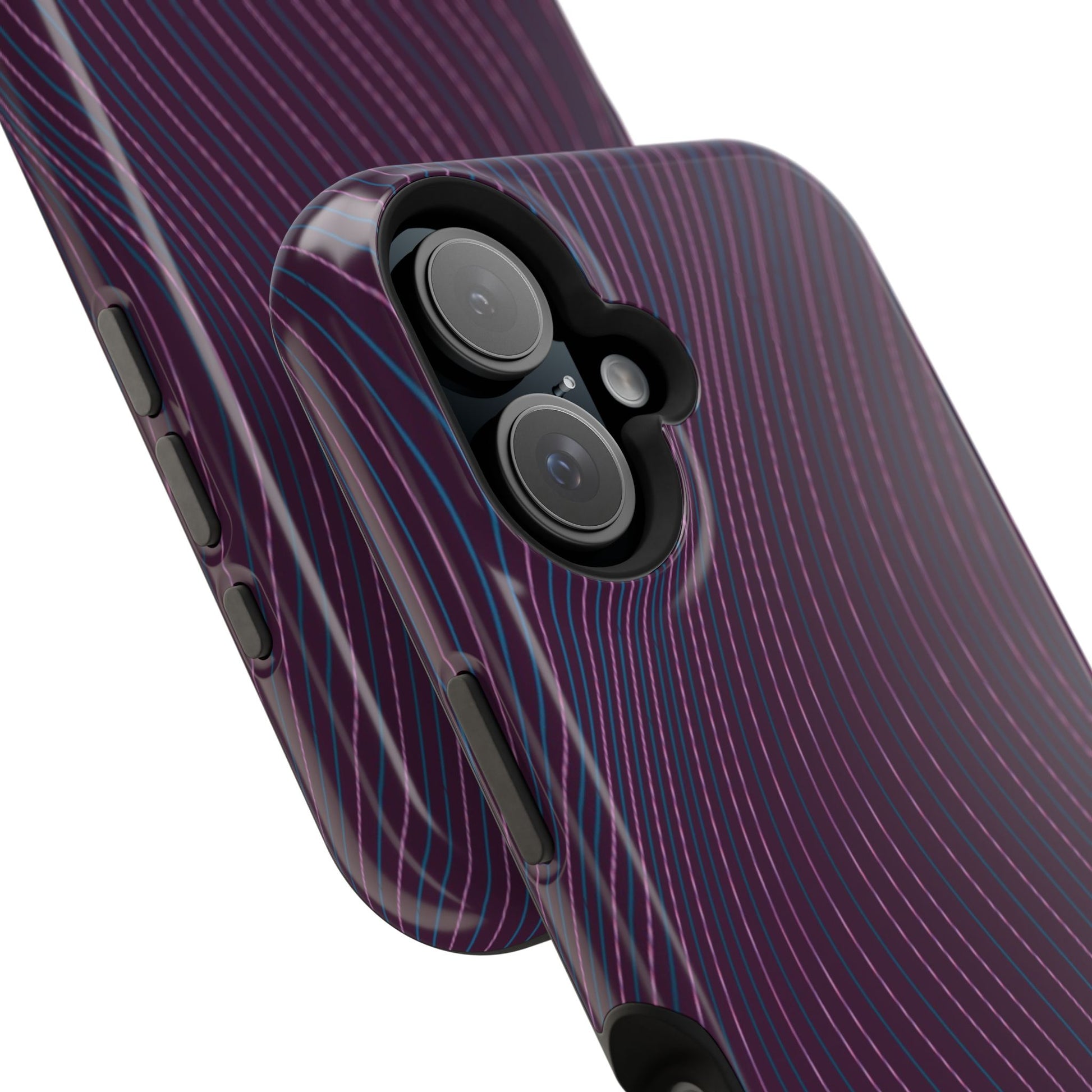 Purple Lines Pattern magnetic phone case. Equipped with an outer polycarbonate shell and inner black TPU lining, this case delivers robust protection thanks to its durable, flexible, impact-resistant nature. Available in a matte or glossy finish, each case comes with an embedded magnet module that is compatible with MagSafe® accessories and a stunning print that fully wraps around your case's exterior.